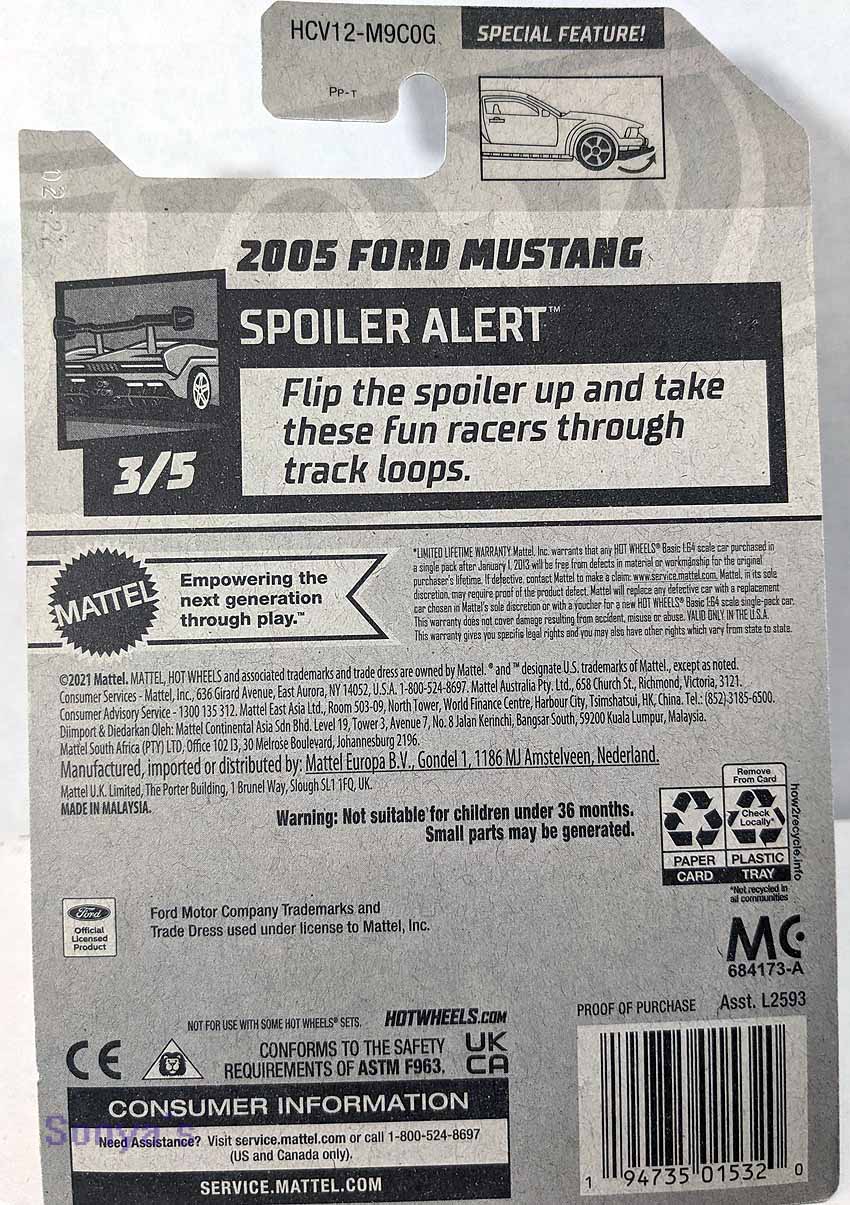 Different take on the Mustang-features silver metallic with a large Hot Wheels overlay on the side and hood along with a checkerboard pattern. 2 Toned wheels-one with black spokes and a yellow rim and the other with grey spokes. Car has a special feature-you can pull out the front spoiler. From the group Spoiler Alert #3 of 5.