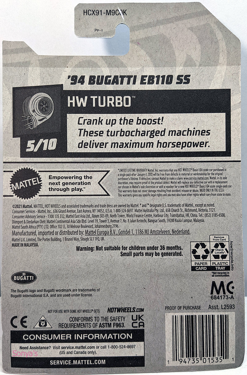 The 94 Bugatti EB110 SS has a timeless look with a sleek profile, blocked spoiler and dark windows. Rides on a black base with plain old school silver hubs. From HW Turbo, car 5 of 10.