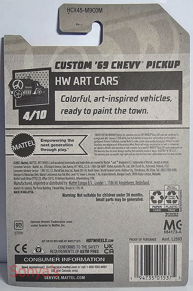 Introducing the Hot Wheels Art Car Custom 69 Chevy Pickup with an eye catching Rubik's Cube look. This custom truck features innovative art car designs sure to catch the eyes of those passing by. With its streamlined pickup body, this truck is the perfect combination of style, performance, and beauty. Has a T on the top and rides on a silver base. From HW Art Cars, car 4 of 10.