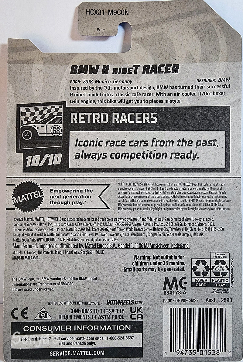 This Hot Wheels Black BMW R nineT Racer 2022 features a classic, retro-style BMW motorcycle design. Its sleek body and traditional colors make it the perfect addition to a die-cast motorcycle collection. With the Hot Wheels badge of quality, you can enjoy the rich details and durability of this eye-catching model. From Retro Racers, 10 of 10.