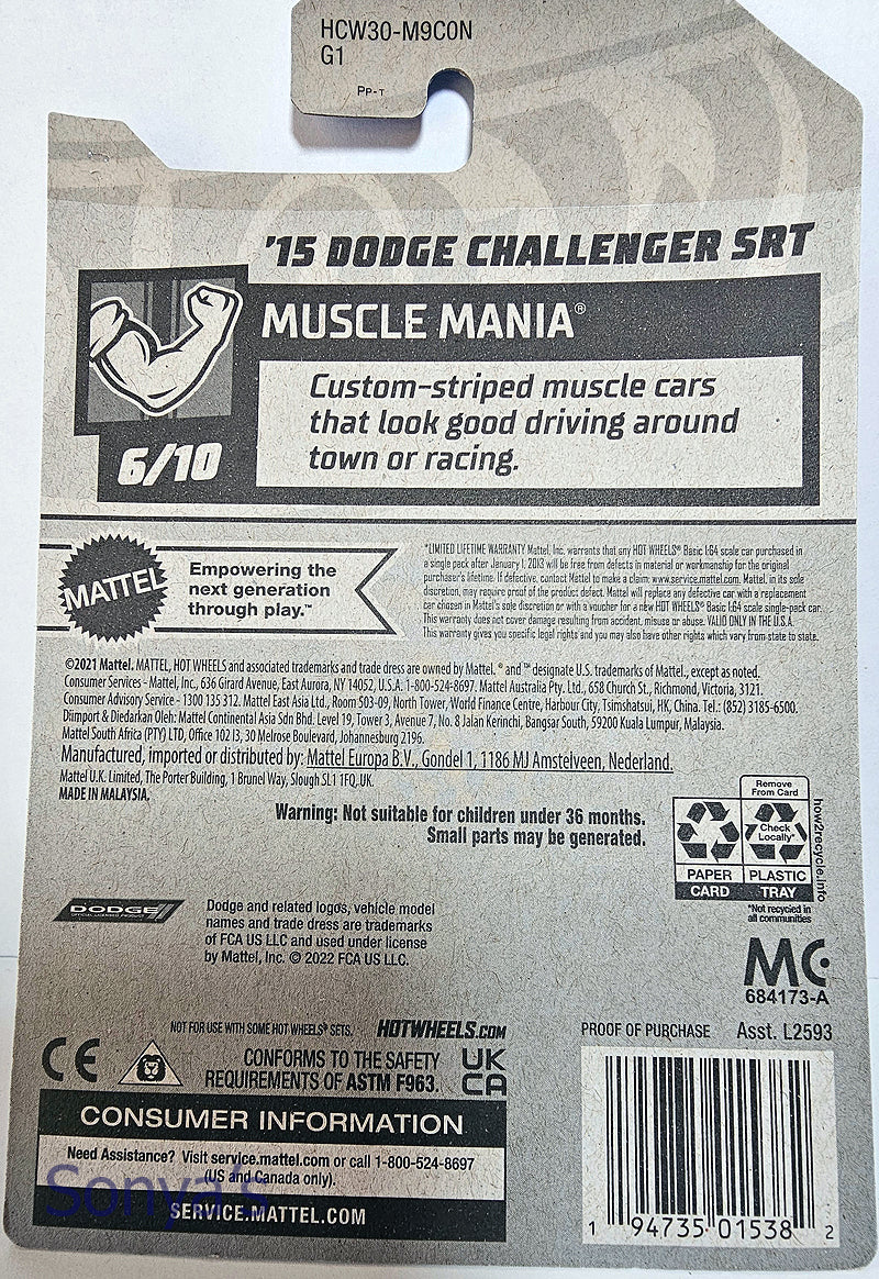 Introducing Hot Wheels' 15 Dodge Challenger SRT 2022. This sleek blue muscle car features the classic Dodge Challenger design that has become an icon of speed and style. Prefect for any Hot Wheels fan, this car delivers the perfect combination of power and finesse. From Muscle Mania, car 6 of 10.