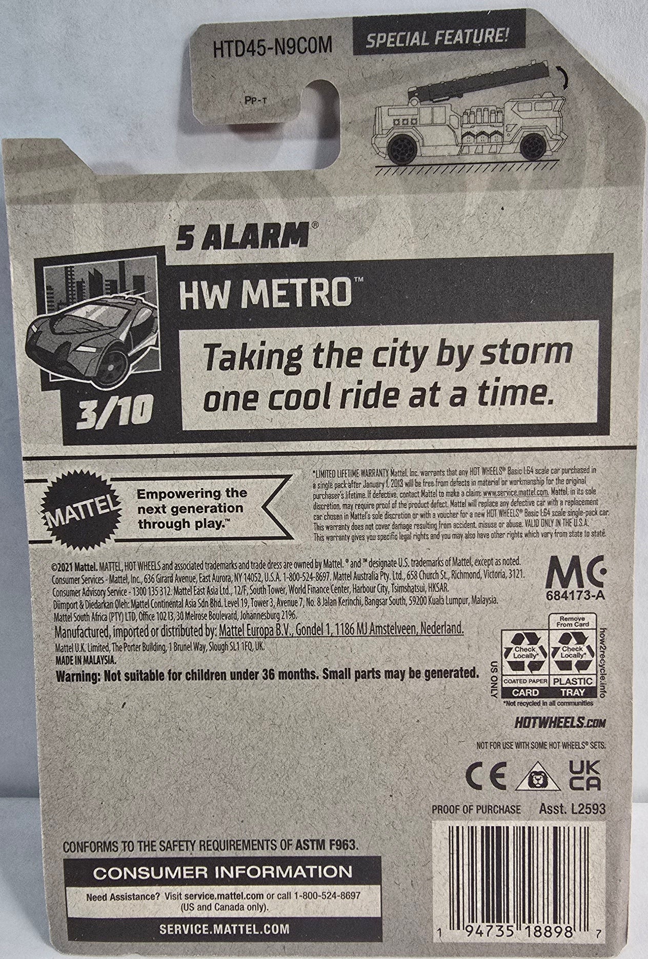 Another recolor of the popular 5 Alarm fire truck with orange and black accents with chrome skirting and copper rims. Special feature-the boom goes up and down. From HW Metro, car 3 of 10.