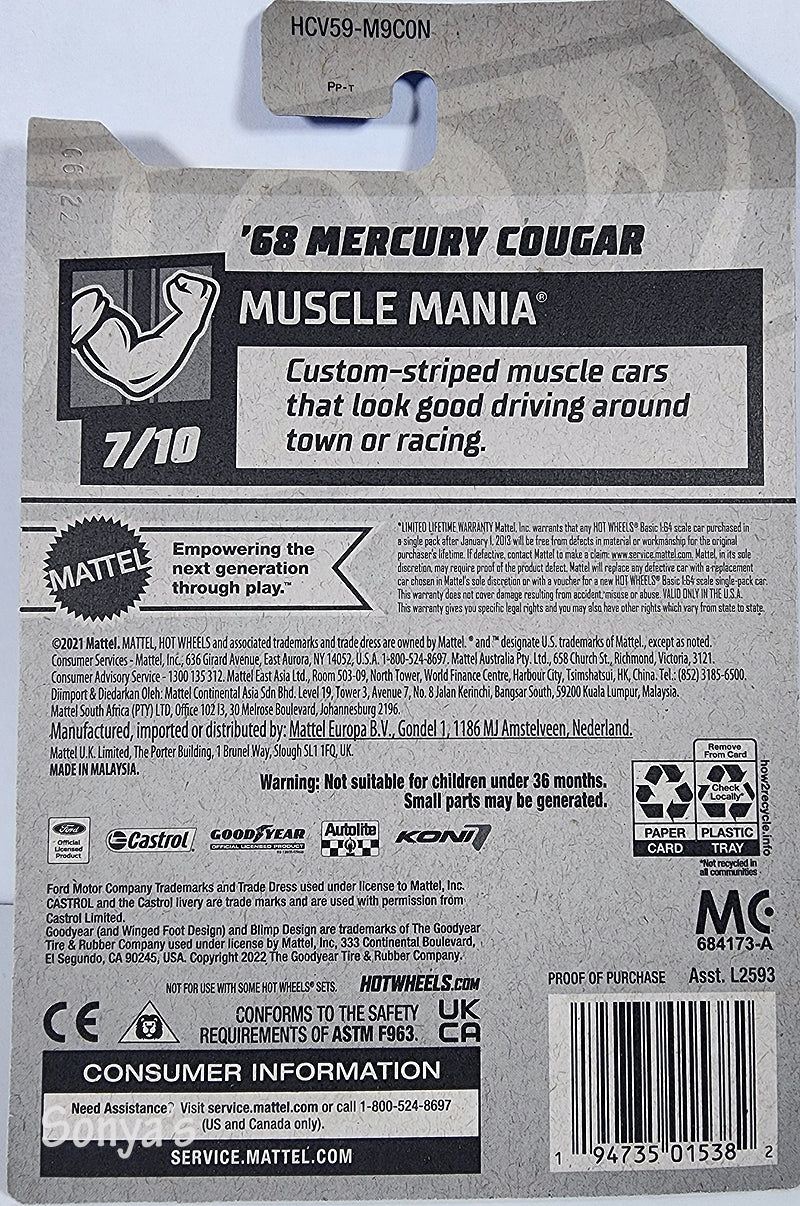 Introduce the Hot Wheels Blue 68 Mercury Cougar 2022 to your collection! This muscle car features a #8 on the door, giving you the classic look and feel of the iconic Mercury Cougar. Perfect for a collector's shelf or a kids' playroom, this Hot Wheels car will be sure to rev up your imagination. Makes a great track car. From Muscle Mania, car 7 of 10.