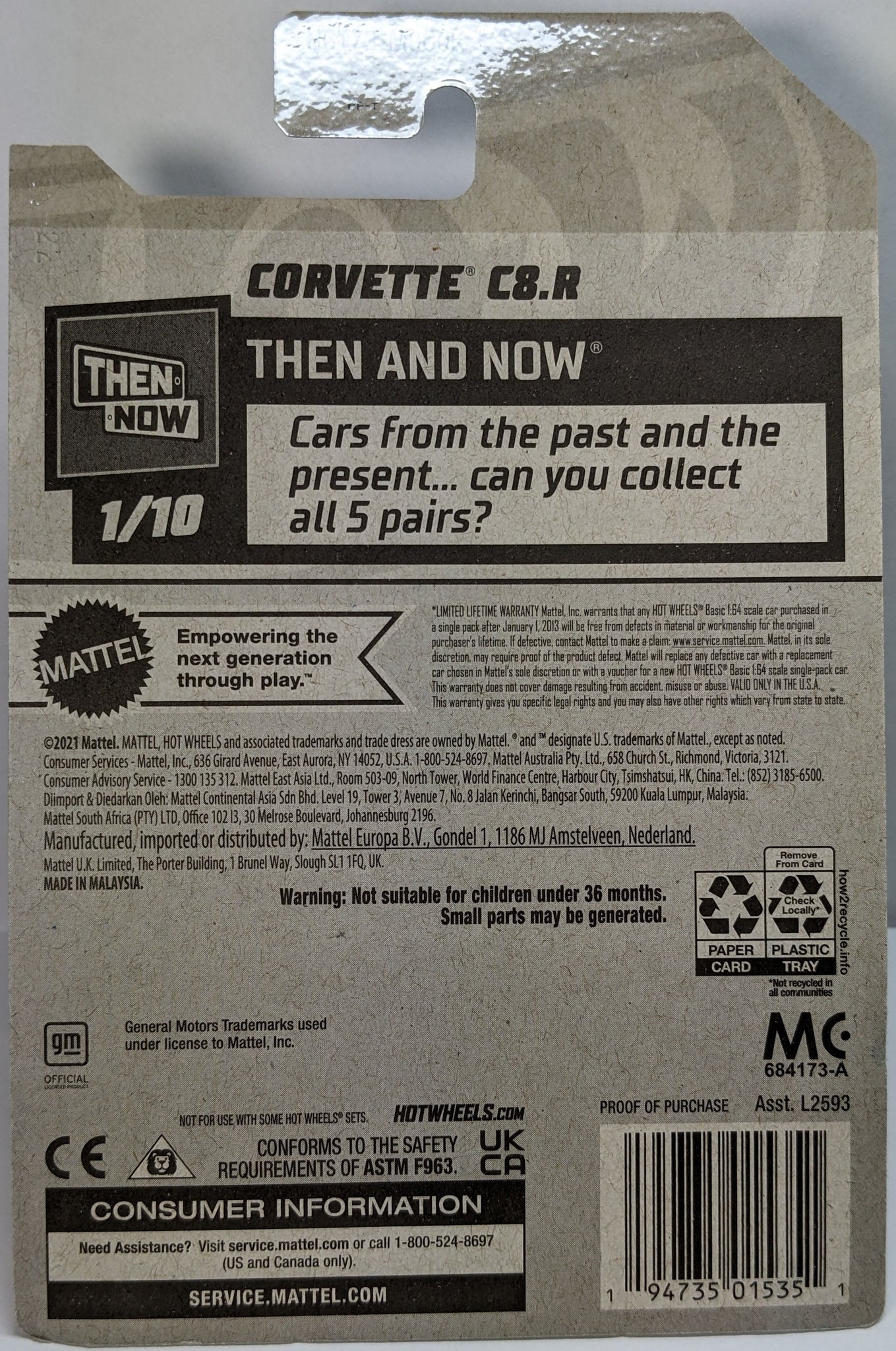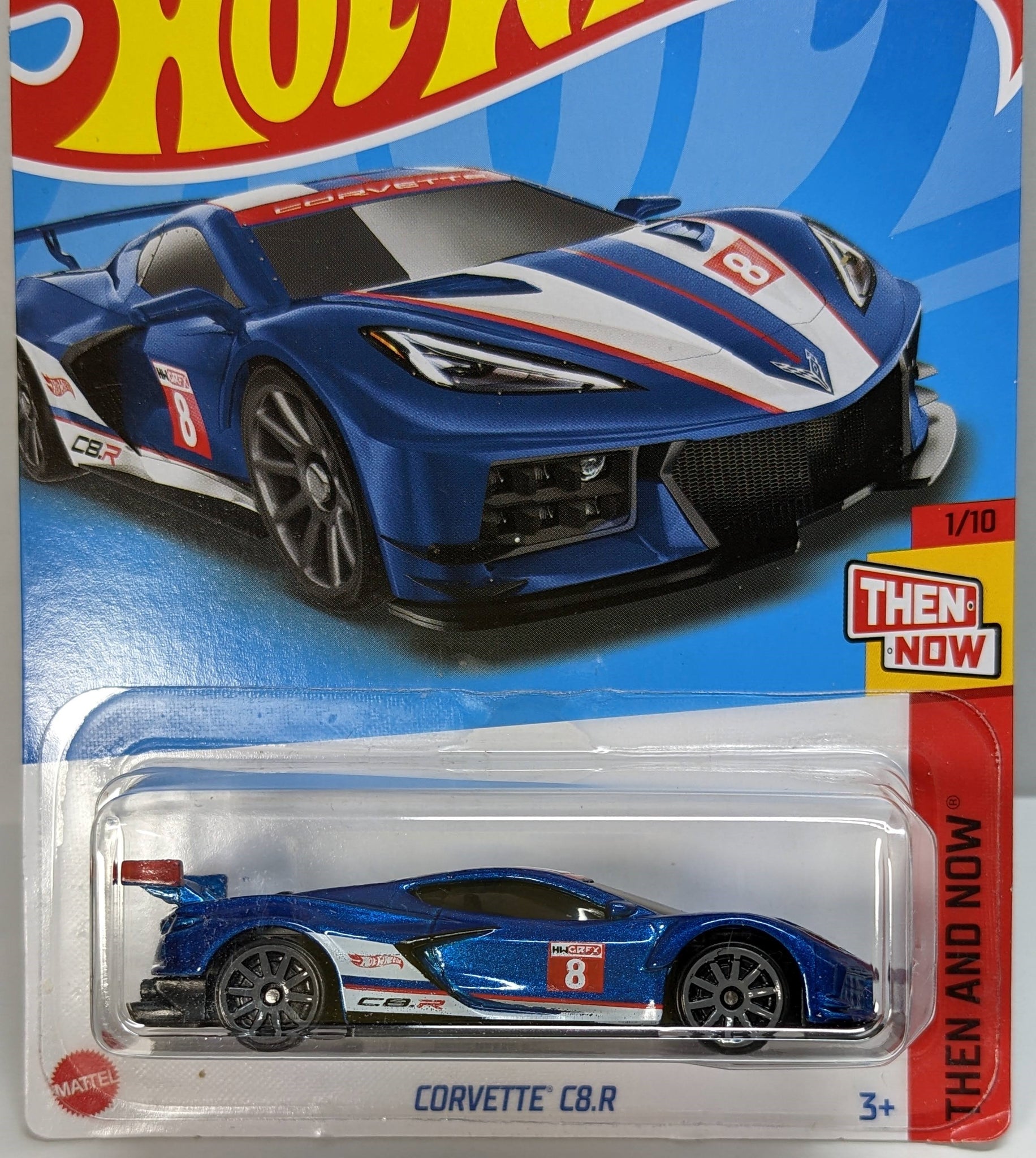 From the amazing Then and Now series, comes this C8.R. Done in a cobalt blue, it sports swooping lines and striking tampos in red and white. Striped on the roof and hood and has a large rear spoilers. The racing tires have micro gray spokes and it rides on a gray base.