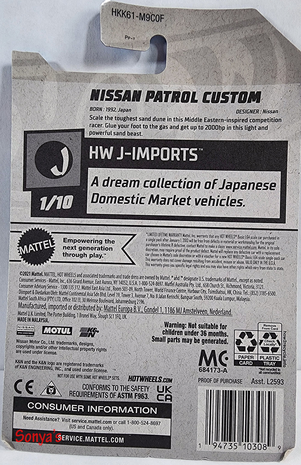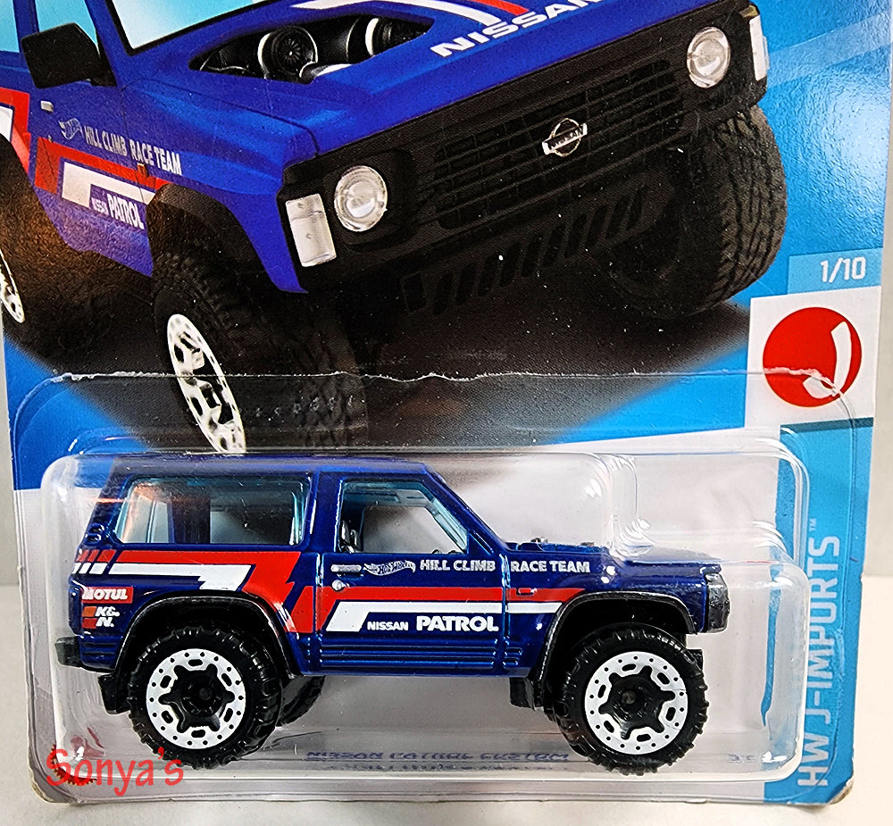 The Patrol Custom in deep cobalt with a variety of tampos, red and white stripes and some large white rims around some off road tires. Moon roof and light blue tinted windows complete the look. From HW J-Imports, car 1 of 10.