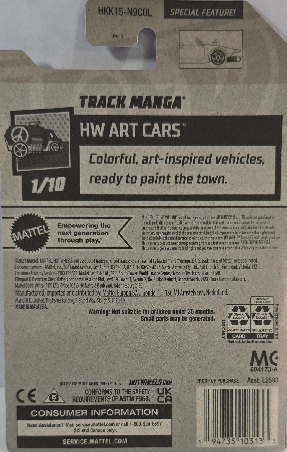 The roadster version of the Mad Manga. Differences include slightly larger wheels, a lack of "stinger" exhaust and an adjustable front bumper. Done in an Oxblood color with a bright plastic blue and yellow base and wheels. From HW Art Cars, car 1 of 10 with the letter K on the hood