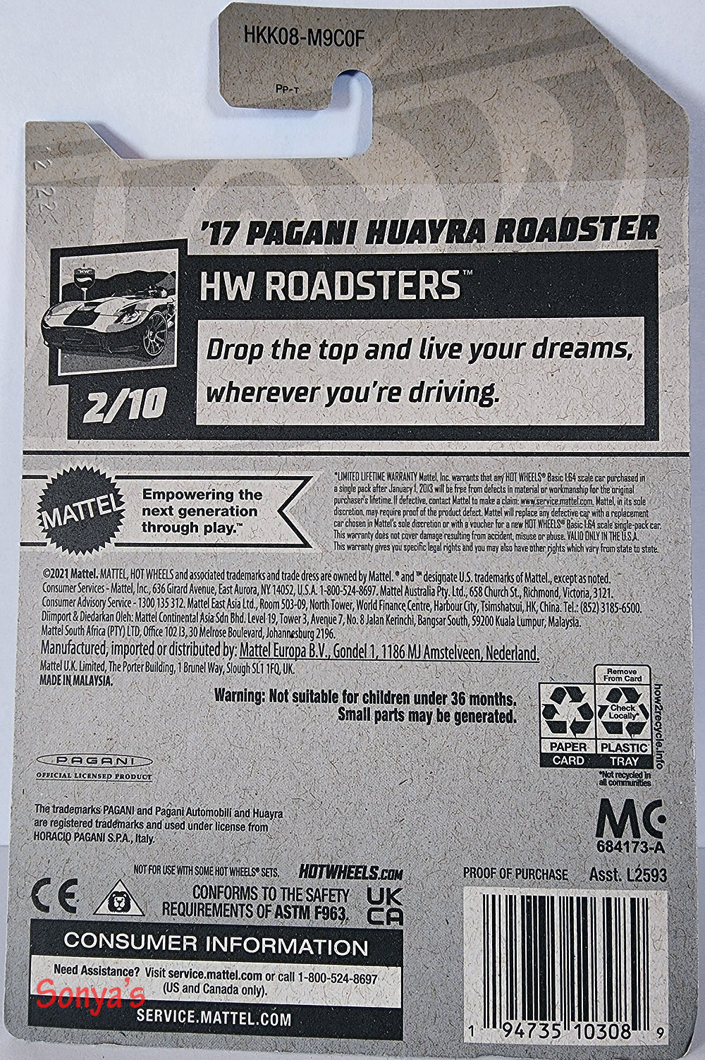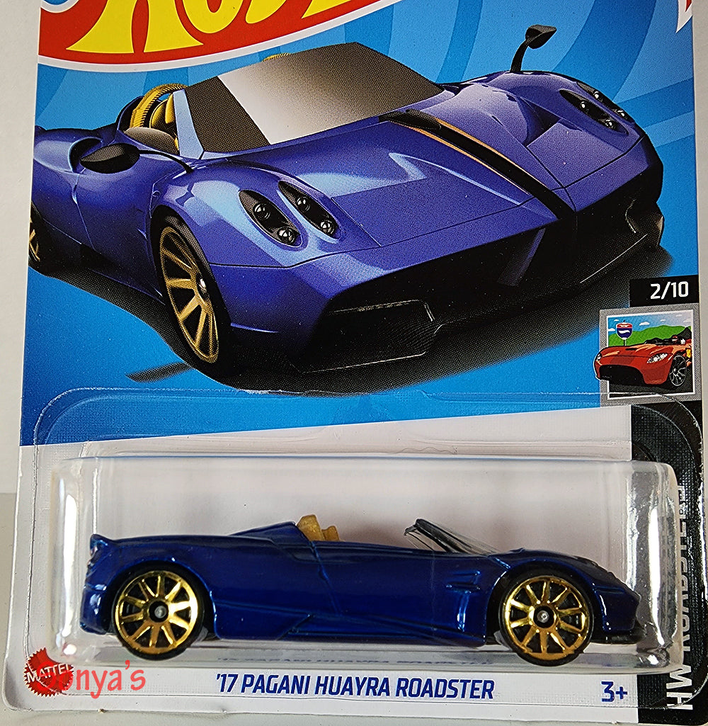 Hot Wheels Cobalt 17 Pagani Huayra Roadster 2023 is an authentic die-cast model car with in a convertible roadster style. This impressive 1/64 scale model car is sure to capture the attention of collectors and Hot Wheels enthusiasts. Features rich cobalt paint with gold multi-spokes, gold interior and a lightly tinted windshiels.