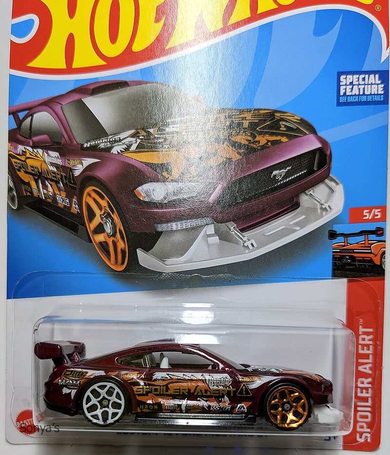 New group here-Spoiler Alert with this graffiti inspired Mustang. Dual colored wheels in white and copper complement the dark maroon paint and the graphics. riding on a black base with a special feature-pull out the front spoiler.