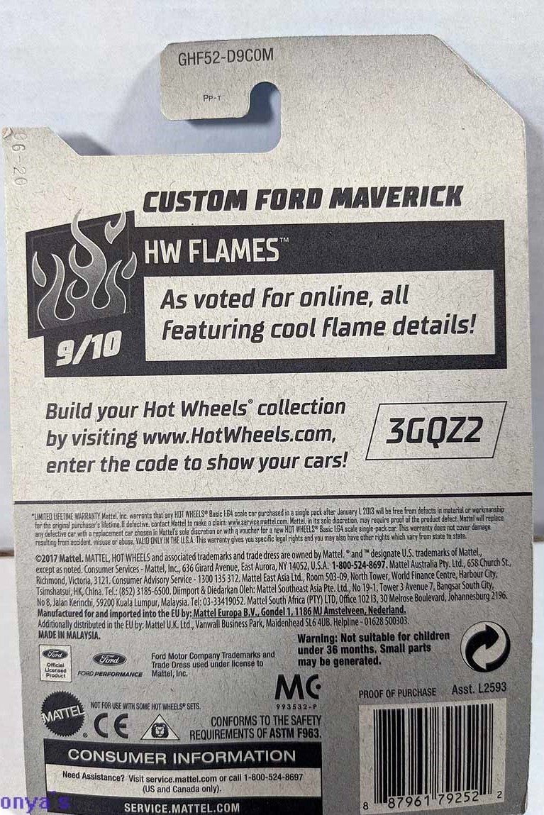 From HW Flames, the Custom Ford Maverick is done in a hot metallic copper paint with yellow flames. Check out the mirrors mounted on the hood. Copper yellow 5 spokes on a black base completes it.