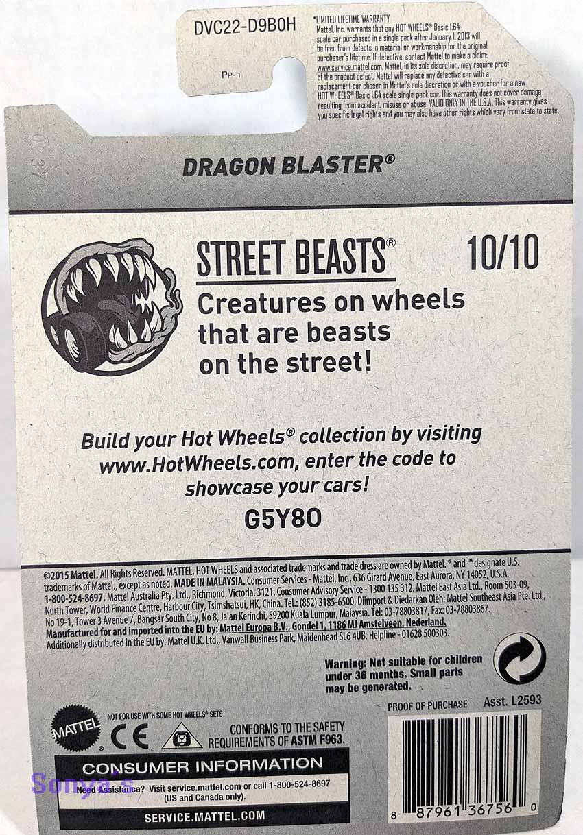From Street Beasts, this car is over the top with the dragon styling. Done in a sea green plastic it has a detailed dragon head and body and sports large iridescent magenta wings. Riding on a chrome metal base with spoked wheels. number 10 of 10 in the series.