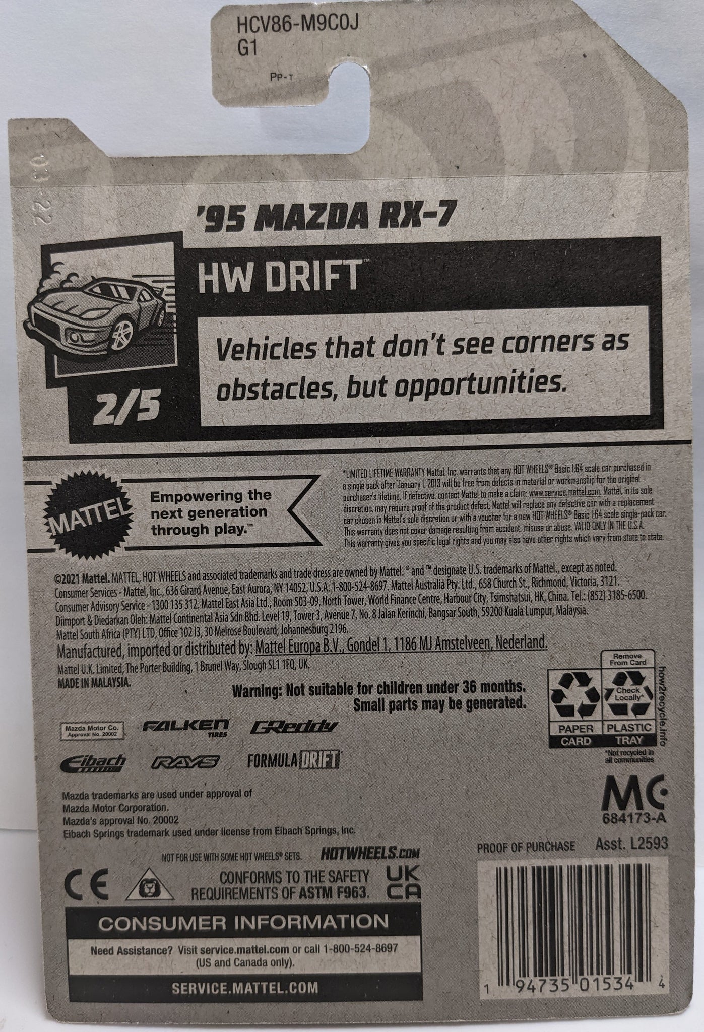 A welcome addition to the Falken family-this Mazda is done in the blue/green livery and tampos in white. Features bright white multi-spoked wheels and rides on a black base. Sharp. Number 2 of 5 in the HW Drift group.
