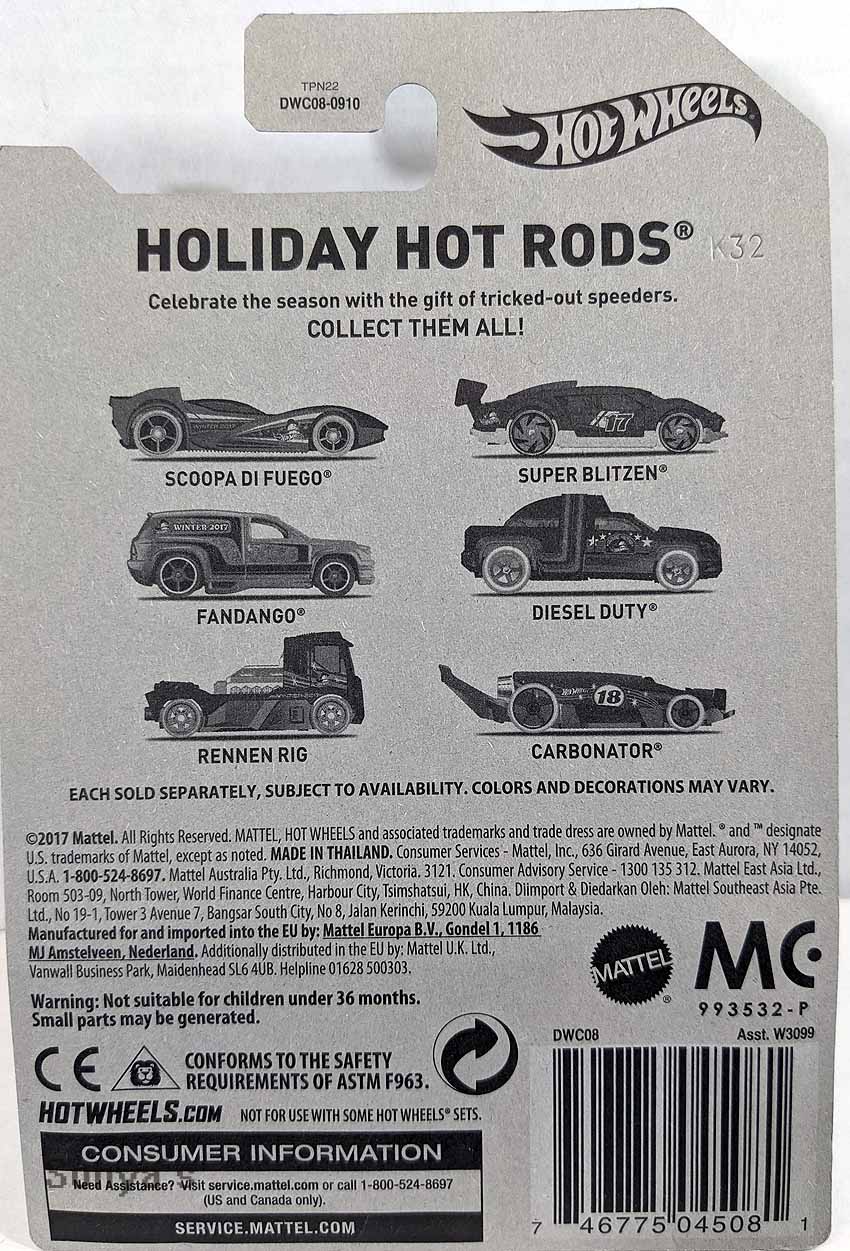From the 2017 Holiday Hot Rods group, the Fandango is a hopped up SUV in gray with gold snowflake deco. Gold multi spoked wheels with a white rim are on a red base and it features black striping and the great Xmas card art.