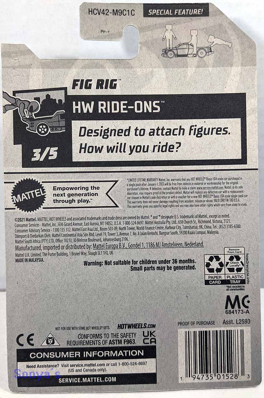 From HW Ride-Ons, the Fig Rig features bright paint colors in blue, yellow and pink with a green base. Has a Ride-ons graphic on the side. Black wheels with a thin white line and checkout the red interior. Also has a special feature-the rear bar allows you to mount a figure. Car 3 of 5 in the group.