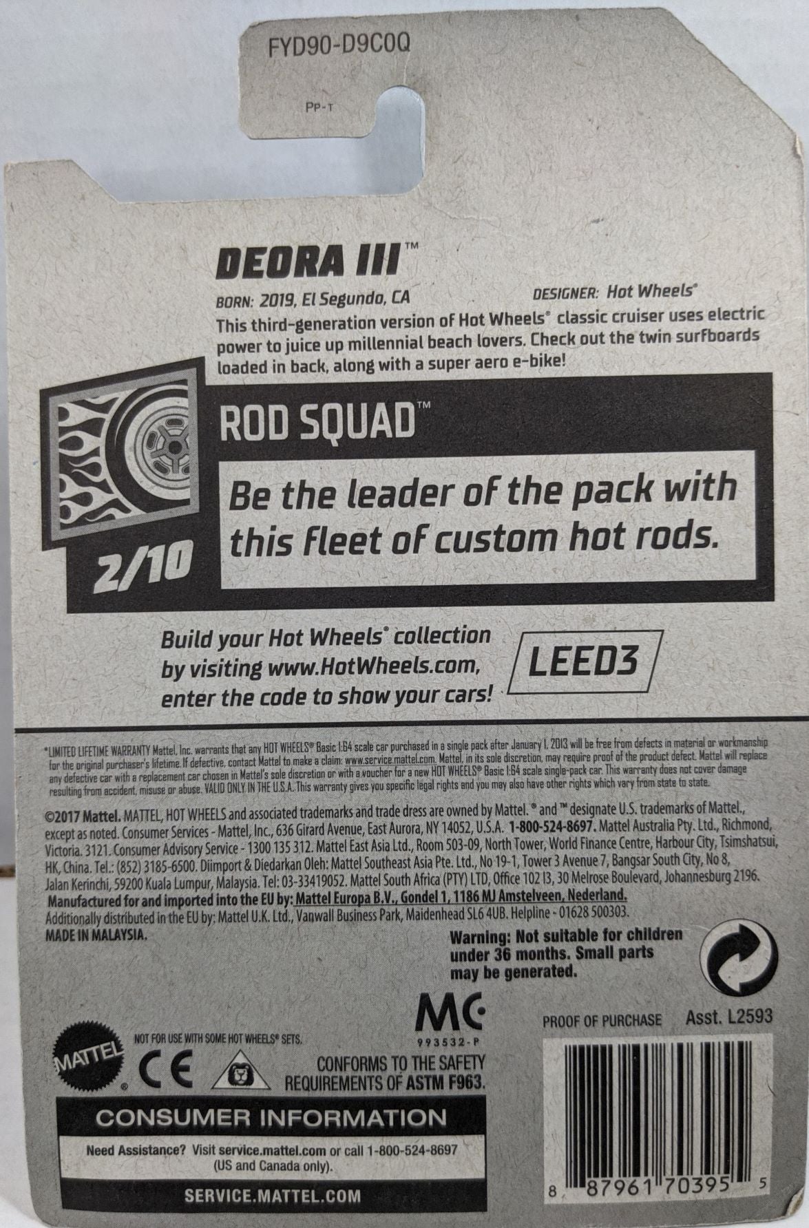 New casting of the Deora. Futuristic and sleek- sports the bicycle in black and surfboard in red. Silver 5 spoke wheels. Black plastic base. From Rod Squad, car 2 of 10. Card dinged on the bottom. edge wear FYD90-D9C0Q