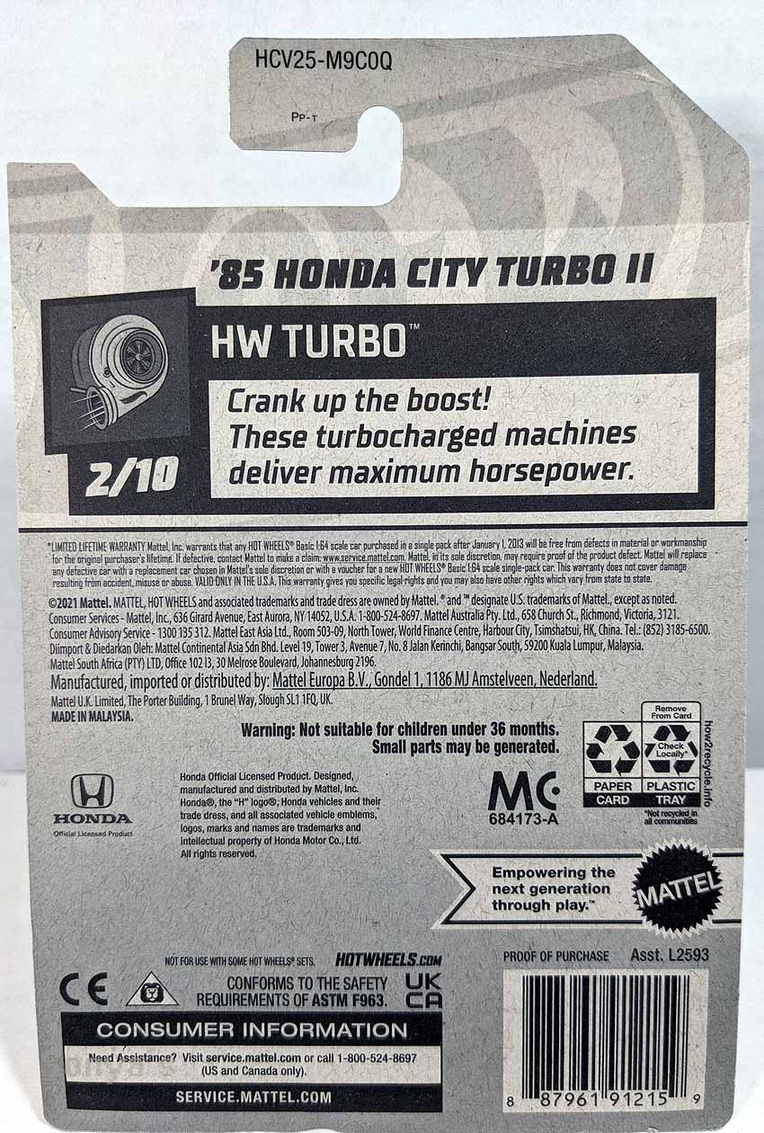 This fun Honda City Turbo just got funner. Done in a loud lime green, it sports all the tampos with the number 2 on the door. Smoked windows and a faux sunroof on a black plastic base. Light gray disc wheels. From HW Turbo, car 2 of 10.