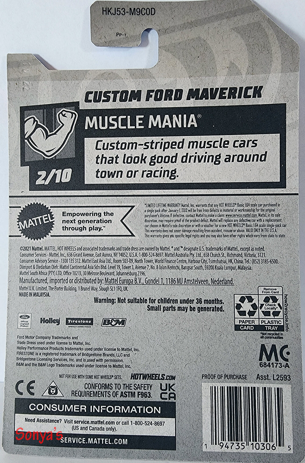 From Muscle Mania, this mint green Maverick is a different take on a classic. Features black, yellow and orange striping and a black base. Windows are down to show the black interior. #2 of 10 in the group.