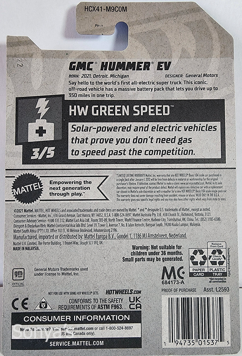 The Hot Wheels Orange GMC Hummer EV 2022 is the perfect choice for collectors. This model features an iconic hummer body shape and t-tops look, providing an exciting and realistic experience. Treat yourself or your loved one to a classic mini ride in a metallic orange with large off road tires. From HW Green Speed, car 3 of 5.