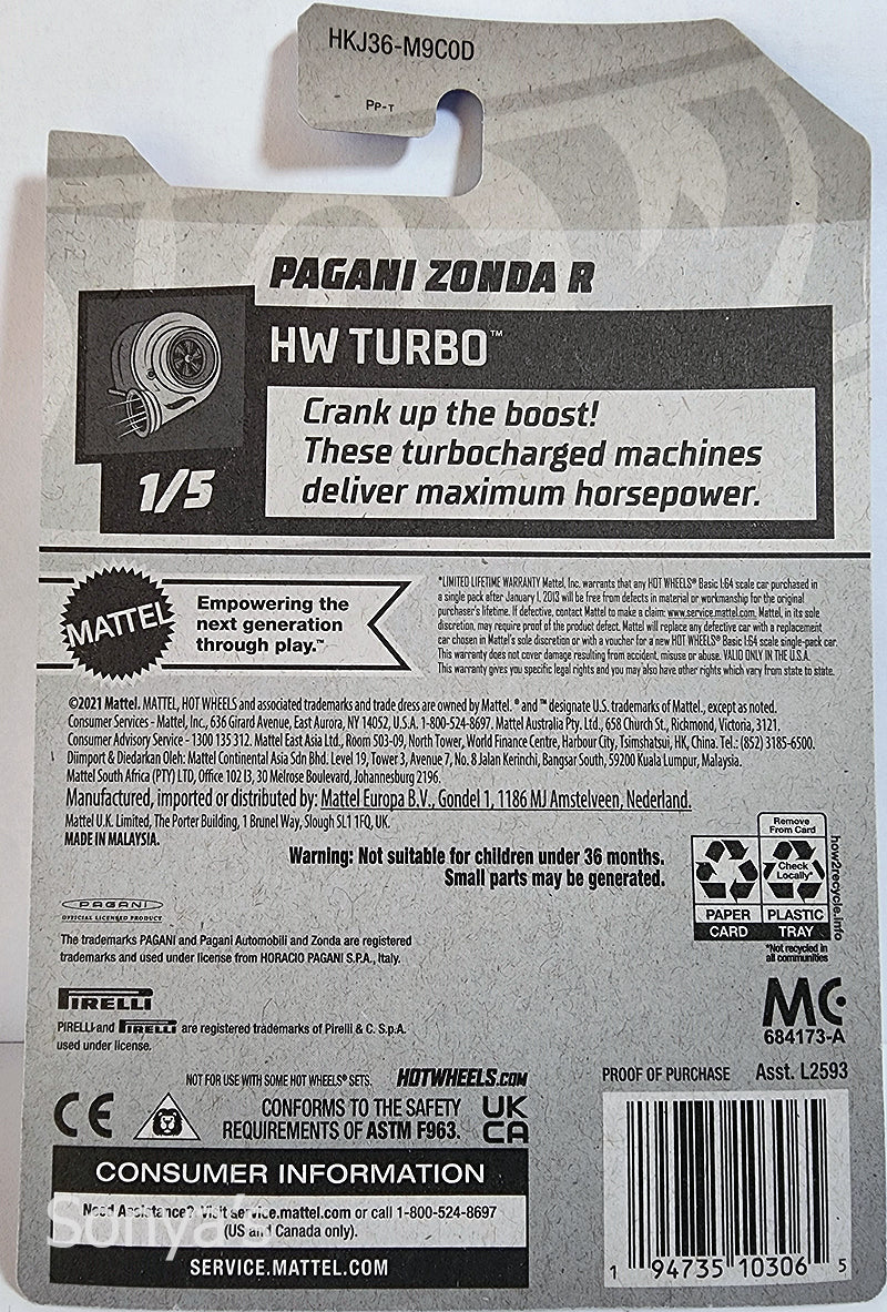 The Hot Wheels White Pagani Zonda R 2022 is the perfect toy for any supercar enthusiast. This exotic 1/64 scale model features intricate detailing and a sleek design for an authentic look inspired by the real-life Zonda R. Bring home the excitement of a supercar today! done in a pearl white with blacked out windows and lime spoked tires. From HW Turbo, car 1 of 5.