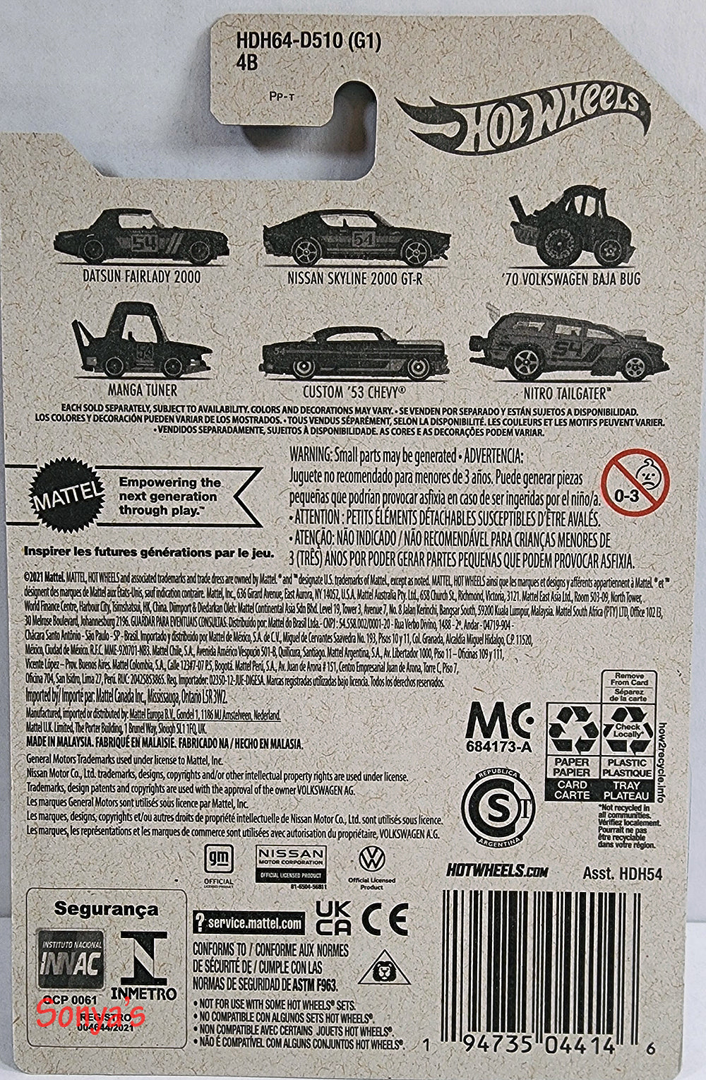 Rev up your engine and add some sparkle to your collection with this Hot Wheels Pearl & Chrome Datsun Fairlady 2000 2023! This classic model features a sleek pearl & chrome look, with cool pink and blue accents. with black interior and blue thin rims. Rides on a bright pink base. Car 4 in the series