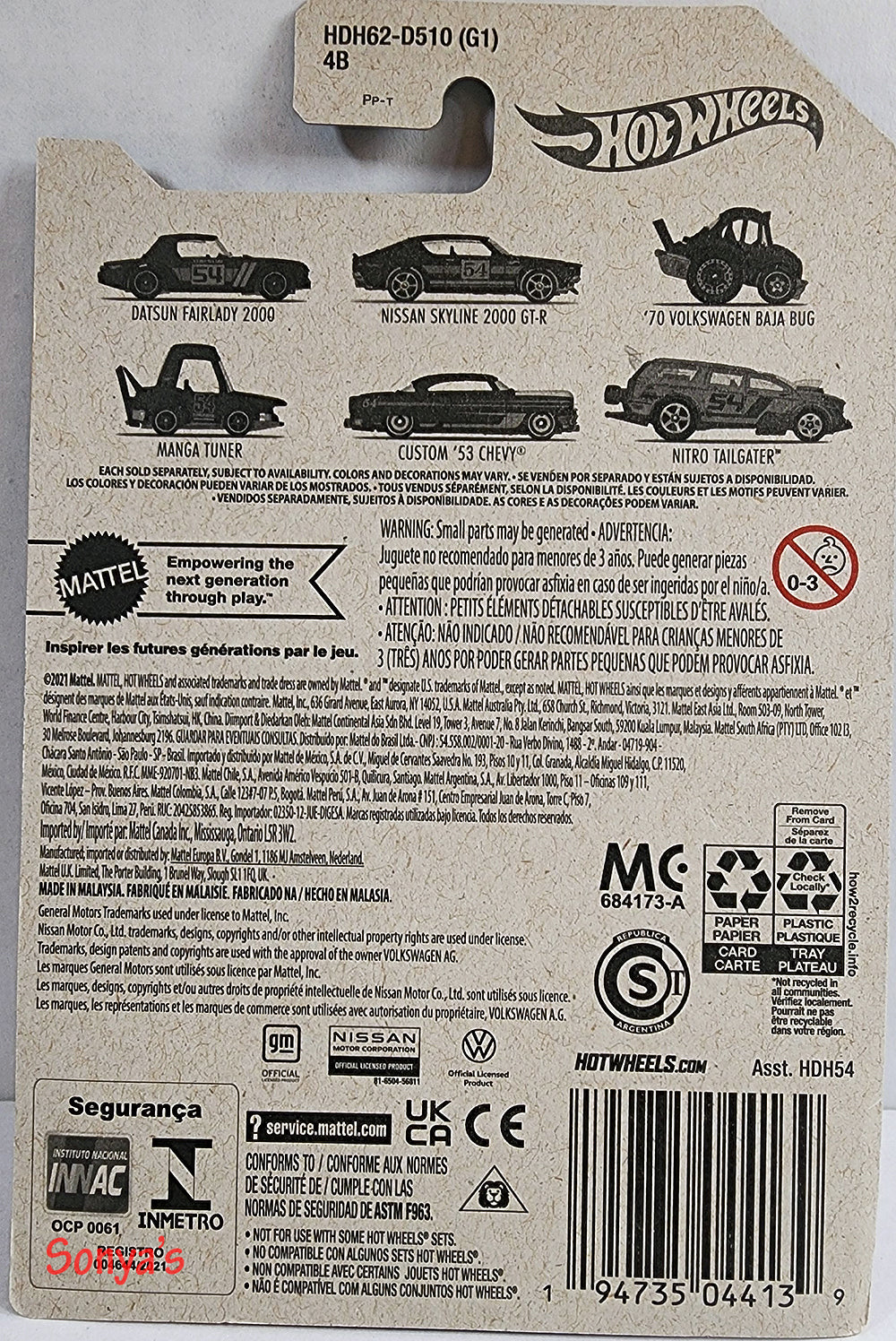 Rev up your engine and add some sparkle to your collection with this Hot Wheels Pearl & Chrome Nissan Skyline 2023! This classic model features a sleek pearl & chrome look, with cool pink and blue accents. with black interior and blue 5 spoke rims. Rides on a bright pink base. Car 2 in the series