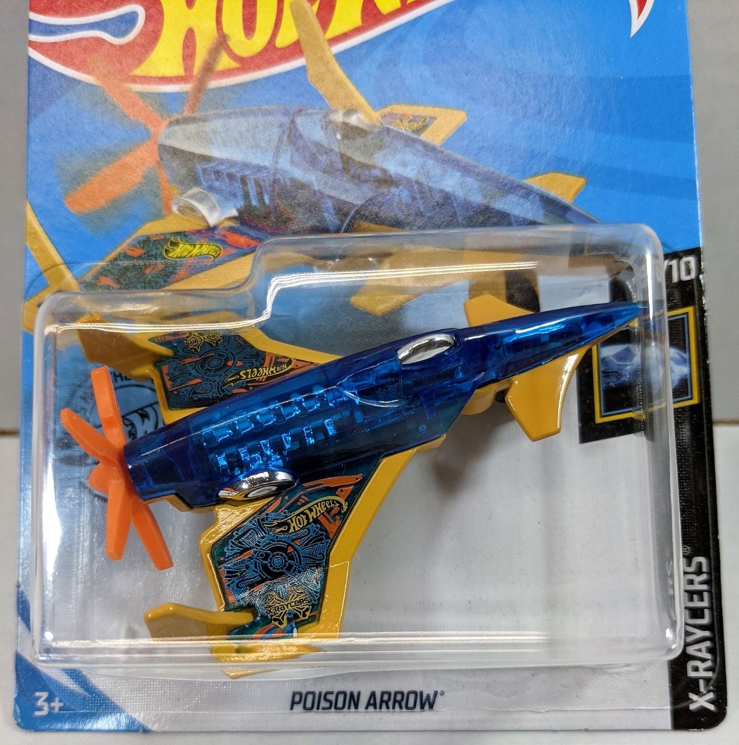 From X-Raycers, the Poison Arrow plane has the translucent blue body and mustard yellow wings sporting Hot Wheels trampos. Orange propeller. Number 8 of 10 in the group. card has soft corner. GHD57-D9C0C