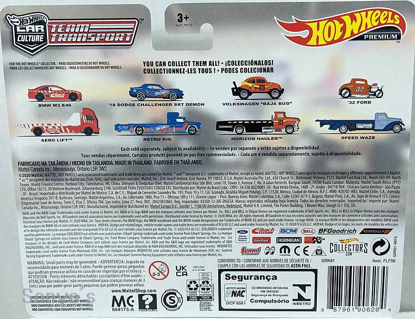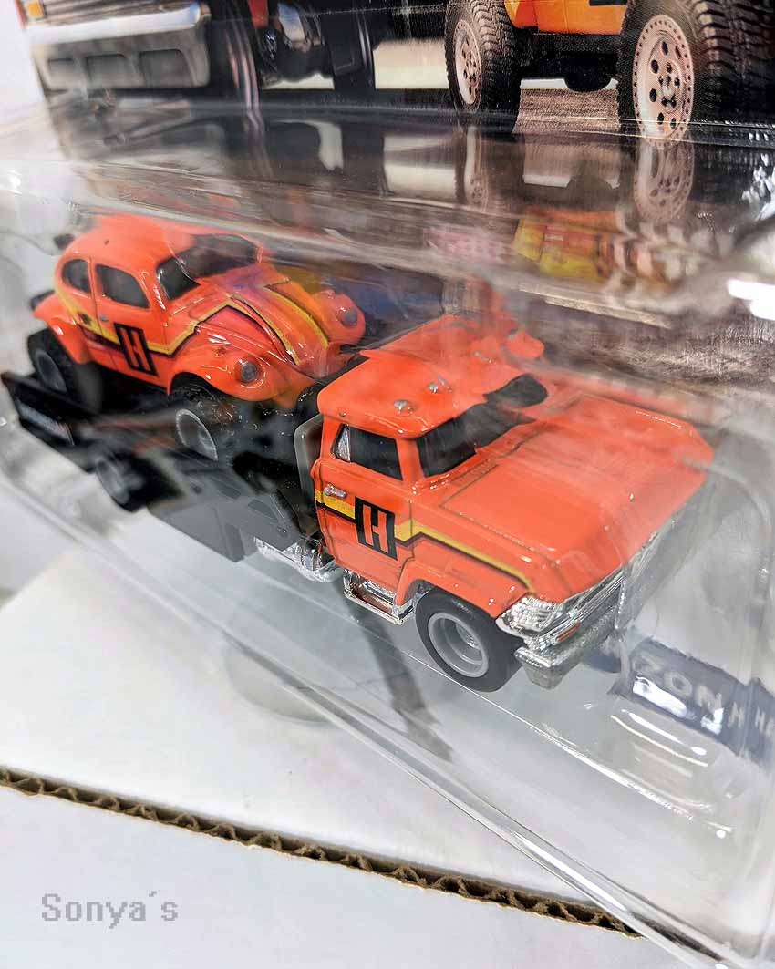 Striking pair with Hoonigan deco and bright orange paint scheme. Classic Horizon Hauler ramp truck and matching VW Baja Bug ready for the sand. These sets features metal/metal construction and roll on Real Riders tires. #31 in the series.