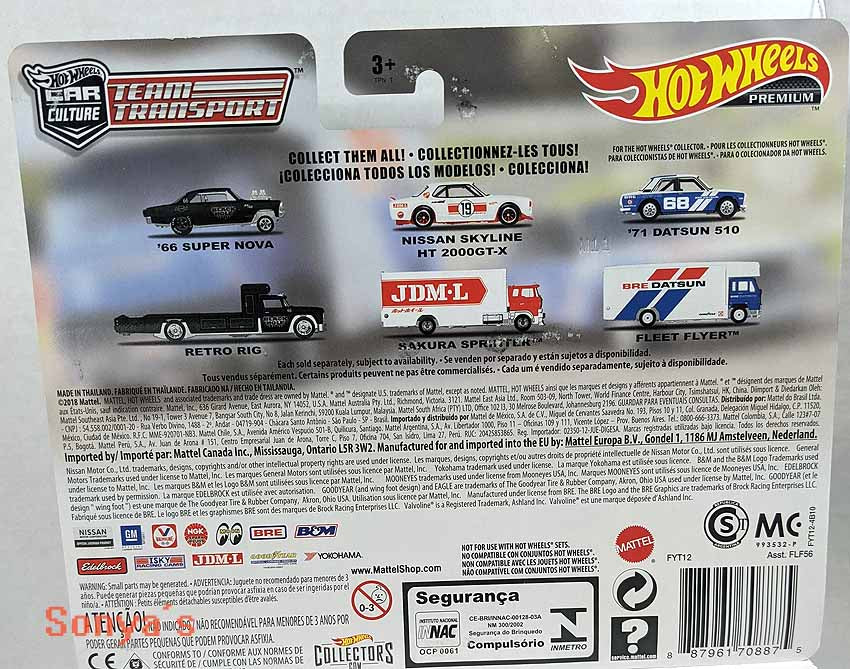 Well done Premium set featuring the 71 Datsun 510 in Bre racing livery of white blue and red. The matching Fleet Flyer is a European hauler is a cabover style with white wheels. These premium sets feature Real Riders rubber tires and metal/metal construction.