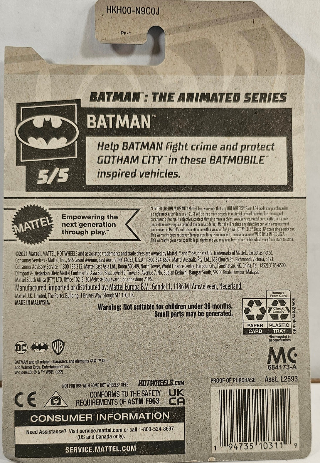 Highly styled, flattened version from the animated series. Features deep purple paint, bright metallic wheels and a light purple double stripe on top. From Batman, car 5 of 5