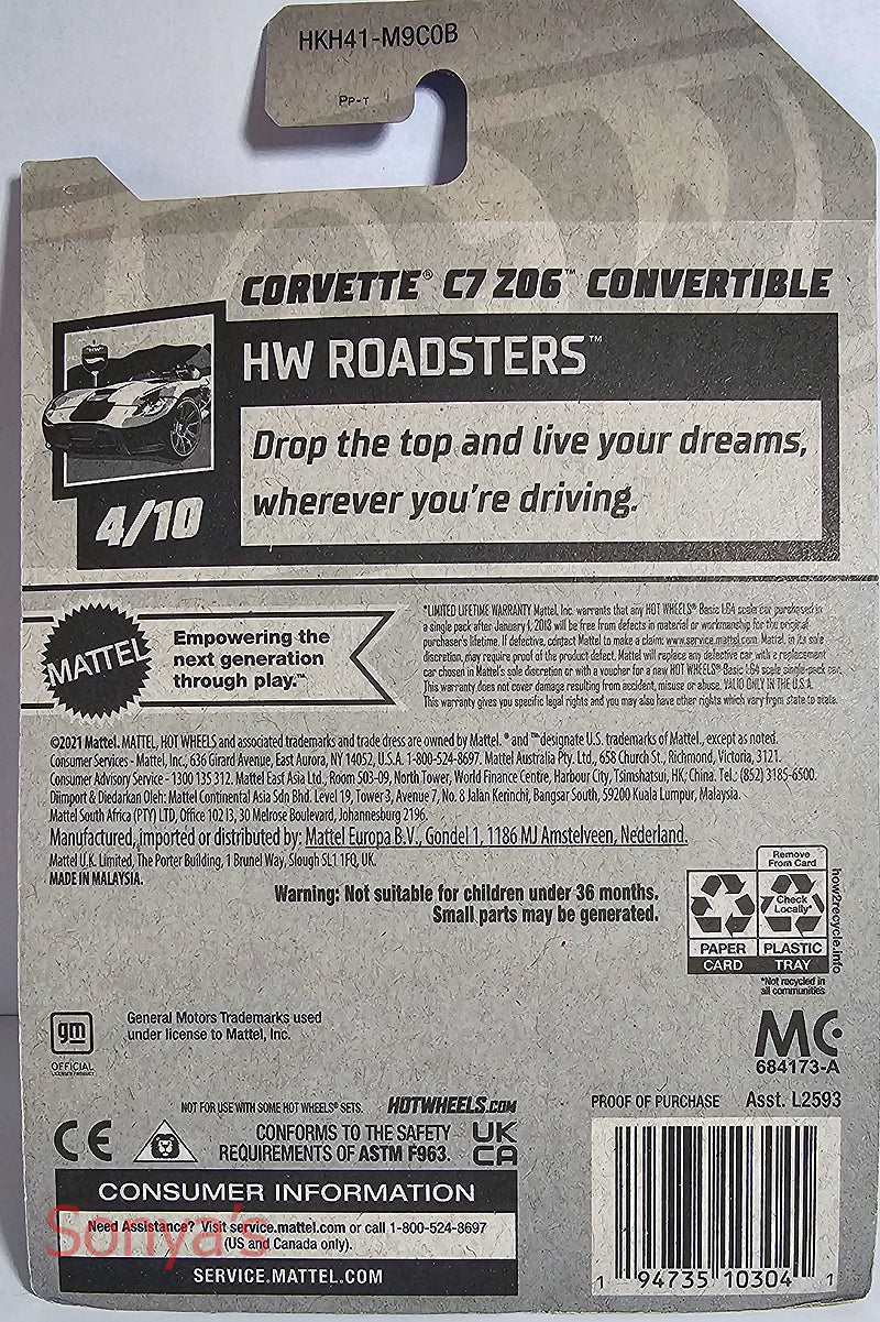 This Hot Wheels Red Corvette C7 Z06 Convertible 2023 boasts an iconic convertible design, classic corvette look, and dynamic red hue. Its realistic construction will provide hours of imaginative play, allowing children to recreate classic car scenes. Features smoked glass, black interior and rides on a black base with red rimmed tires. From HW Roadsters, car 4 of 10.