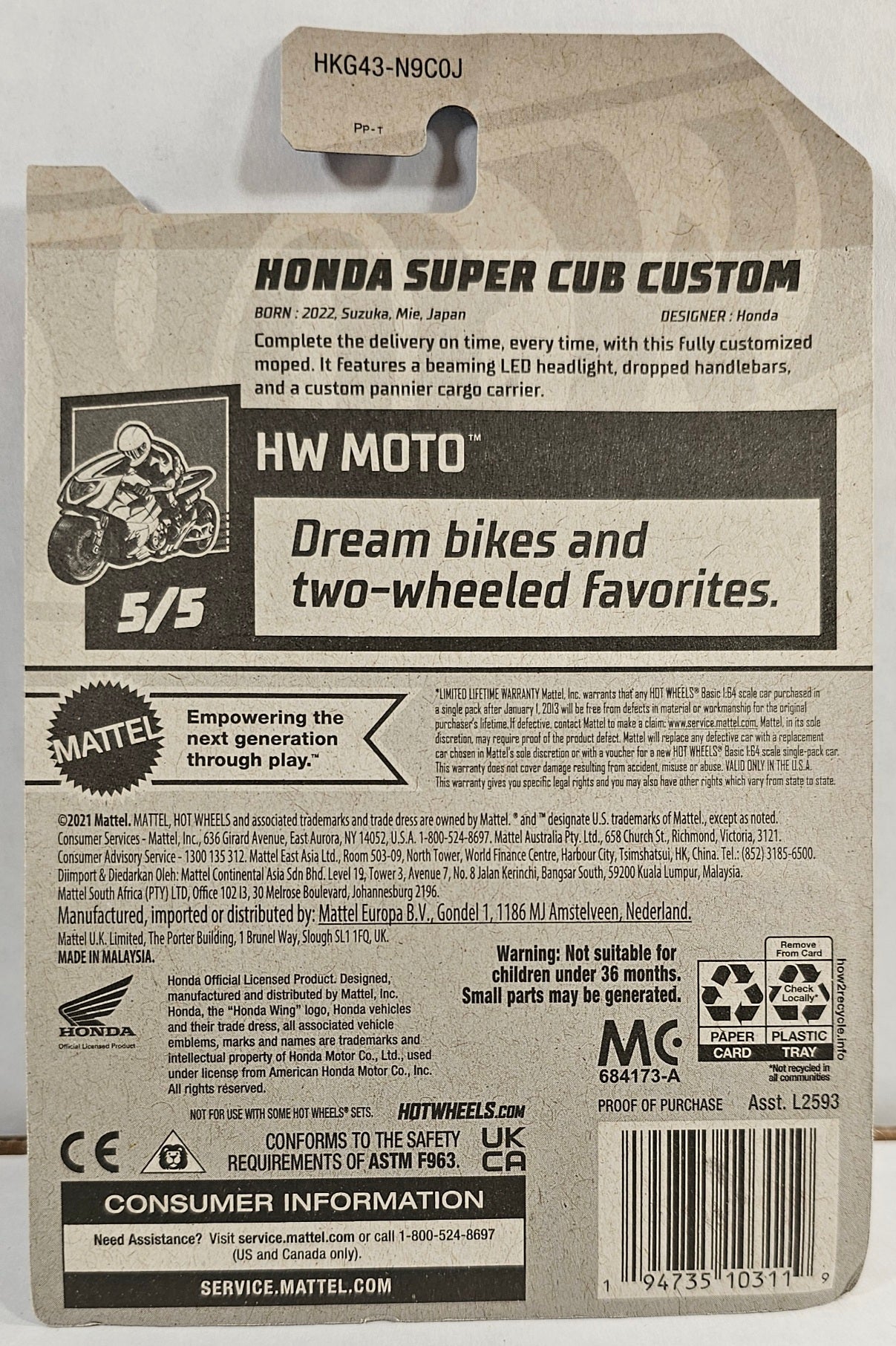 Another Super Cub recolor-this time in classic red and white. Large wheels have a red rim and handles are silver. From HW Moto, car 5 of 5