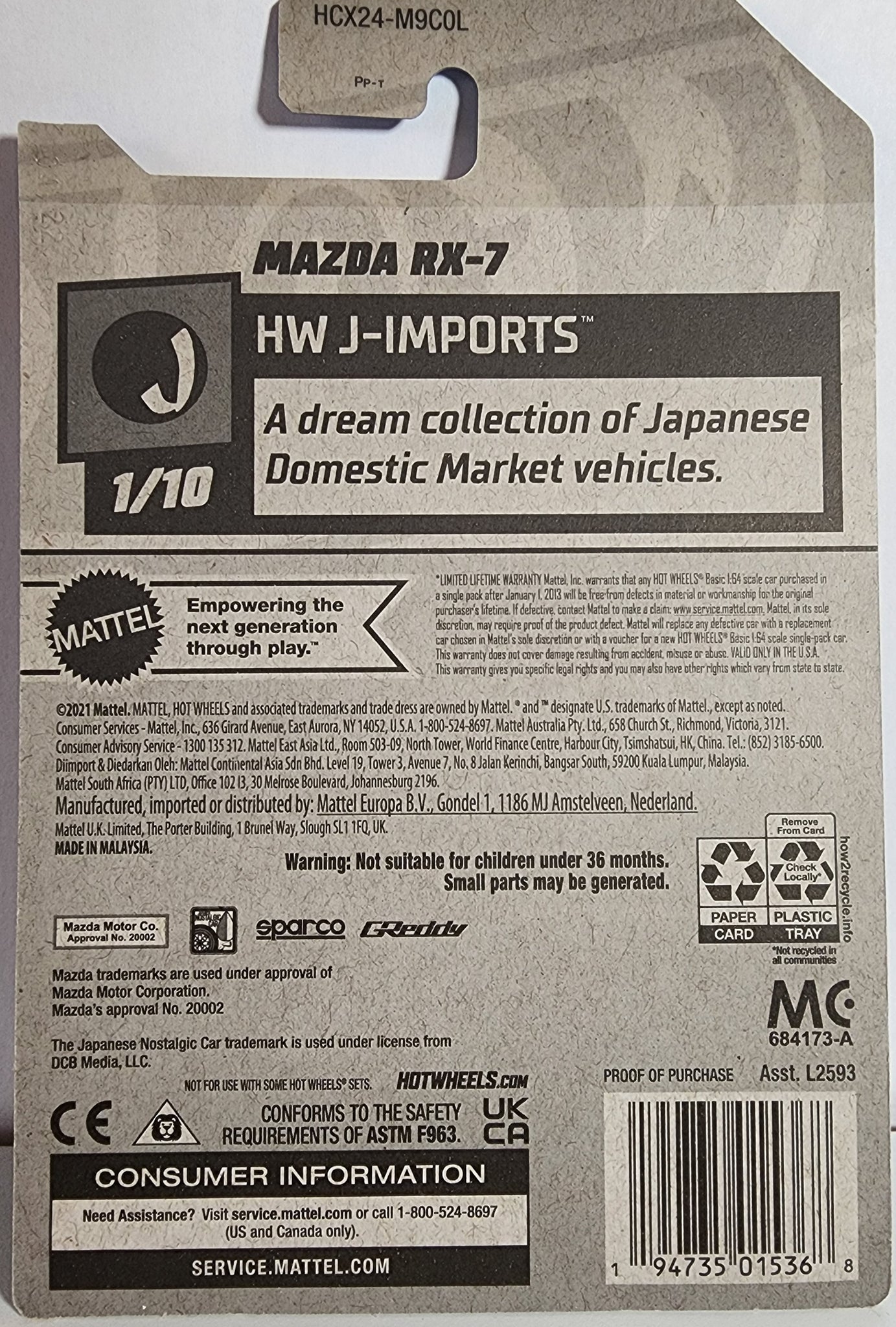 Hot Wheels Red Mazda RX-7 2022 is a perfect replica of the classic Japanese sports car. This 1:64th scale model has a die-cast metal body and realistic details, giving it a dynamic, functional look. It's perfect for any collector or enthusiast looking for an authentic sports car model. Features gold rims, and smoked windows on a black base.