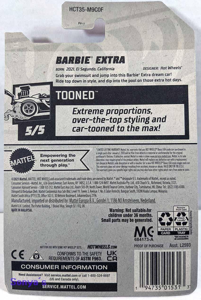 Great addition to the Barbie family! This sporty little car starts with a silver body and winged doors. Convertible of course, and shows off the bright pink interior and has a bright pink base. Yellow stars mark the front lights and pink stars mark the rears. Topping it off is the large fuschia double spoked tires. From Tooned, #5 of 5