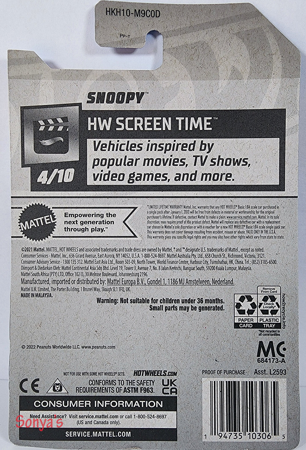 Bring classic airplane fun to your collection with Hot Wheels' Snoopy 2022. This sleek concept car captures the timeless classic of the beloved Peanuts character, outfitted with bold lines and an imaginative design. Enjoy a timeless classic in your Hot Wheels collection. Features the classic red doghouse, a green base and chrome engine. From HW Screen Time, car 4 of 10.