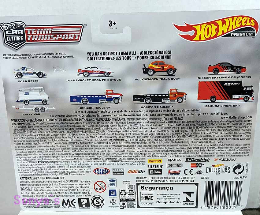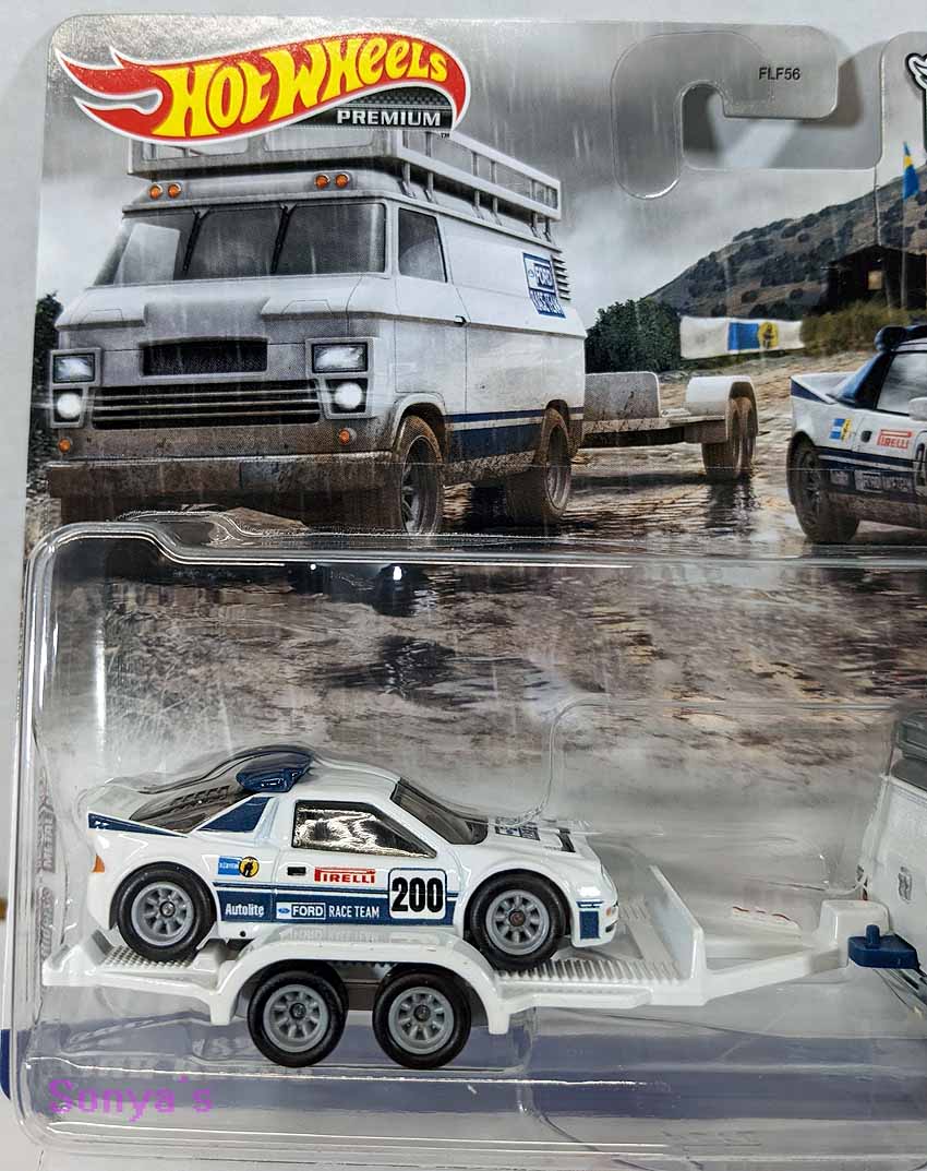 Team Transport featuring a Rally van with Ford Race Team tampos and done in a crisp blue and white. Van features a cargo topper, painted lights and gray wheels. a white open utility trailer is hitched up and towing a matching Ford RS200 with crisp racing tampos, smoked windows and painted lights. These sets are premium featuring Real Rider tires and metal/metal construction.