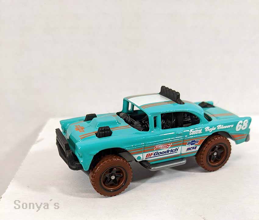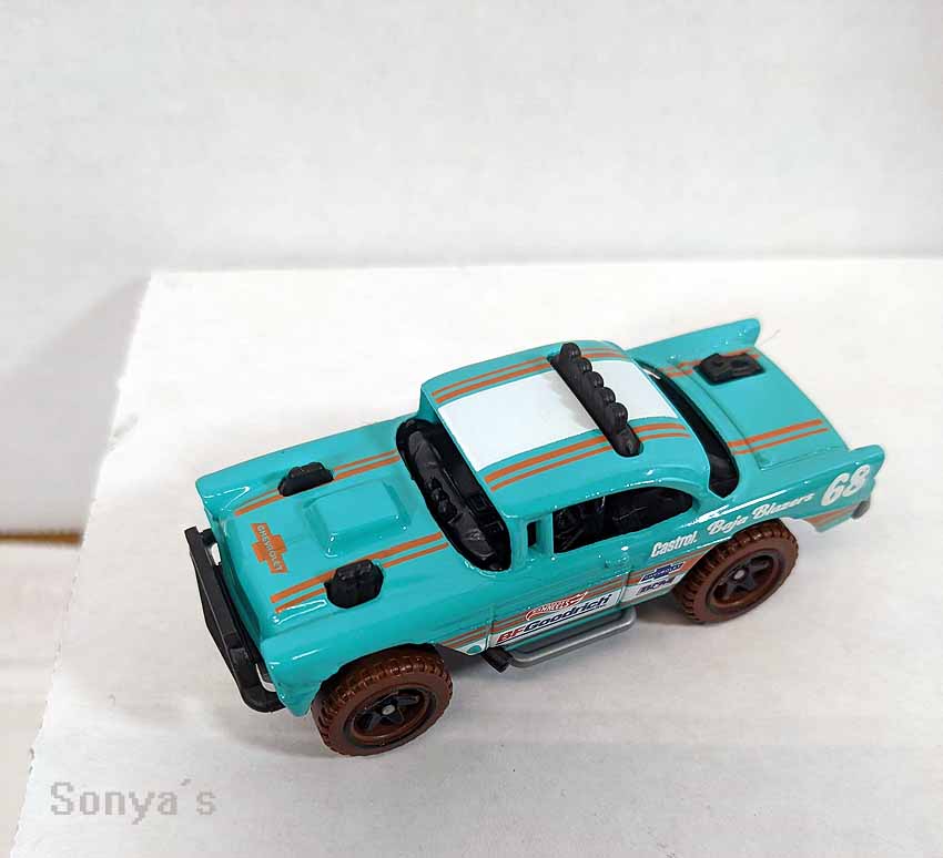 A new twist on this Bel Air with a light green/turquoise color racing tampos and large brown tires. Features the number 68 on the rear with black interior on a gray base. From Baja Blazers, car 10 of 10. Loose car out just for photos.