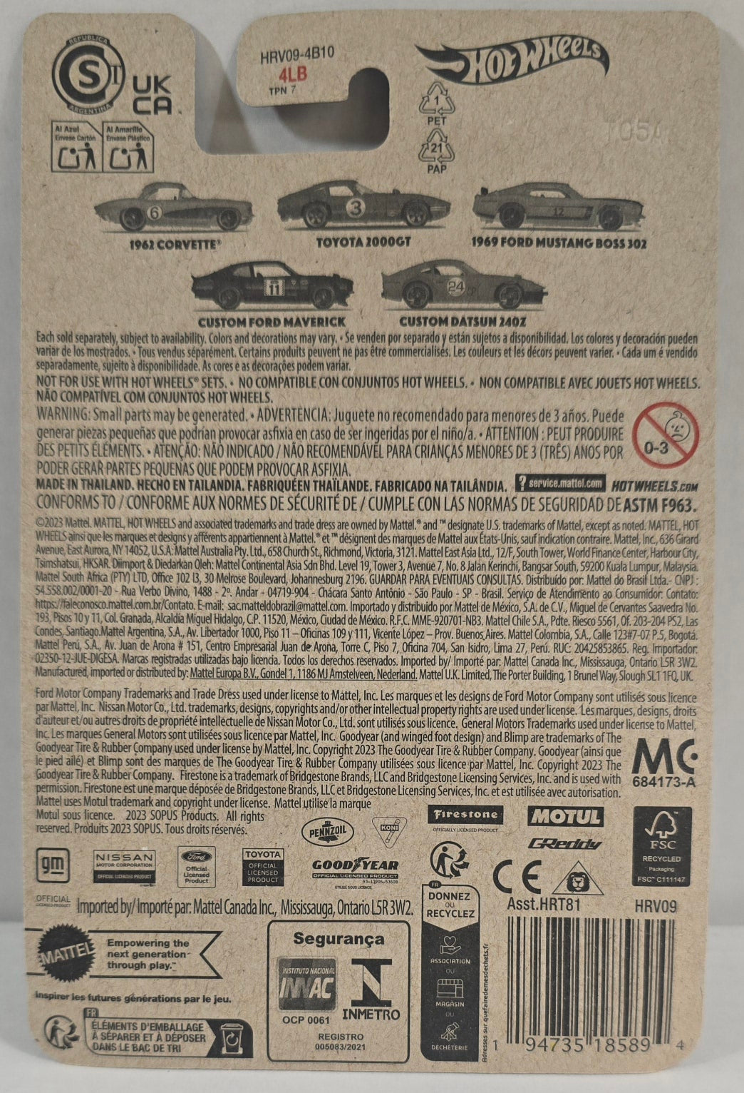 The new Silver Series Vintage Racing sets include cars like this Ford Maverick. These cars feature wheel upgrades, some have metal bases and special tampos and paint jobs. This one has pearl black paint, sharp deco with painted lights and silver rims on a black base.