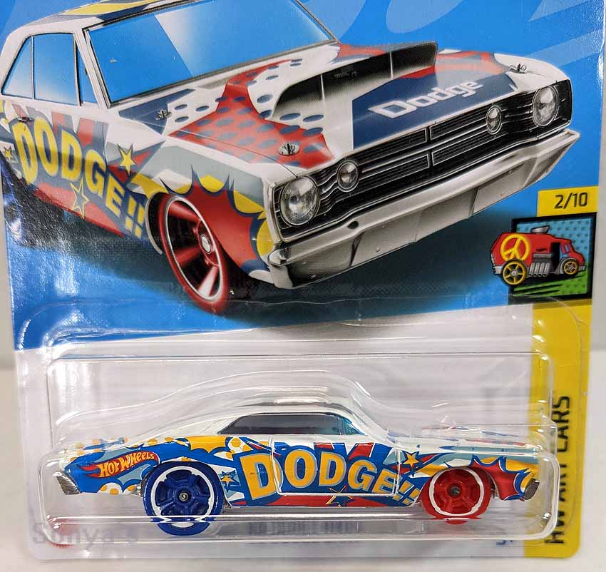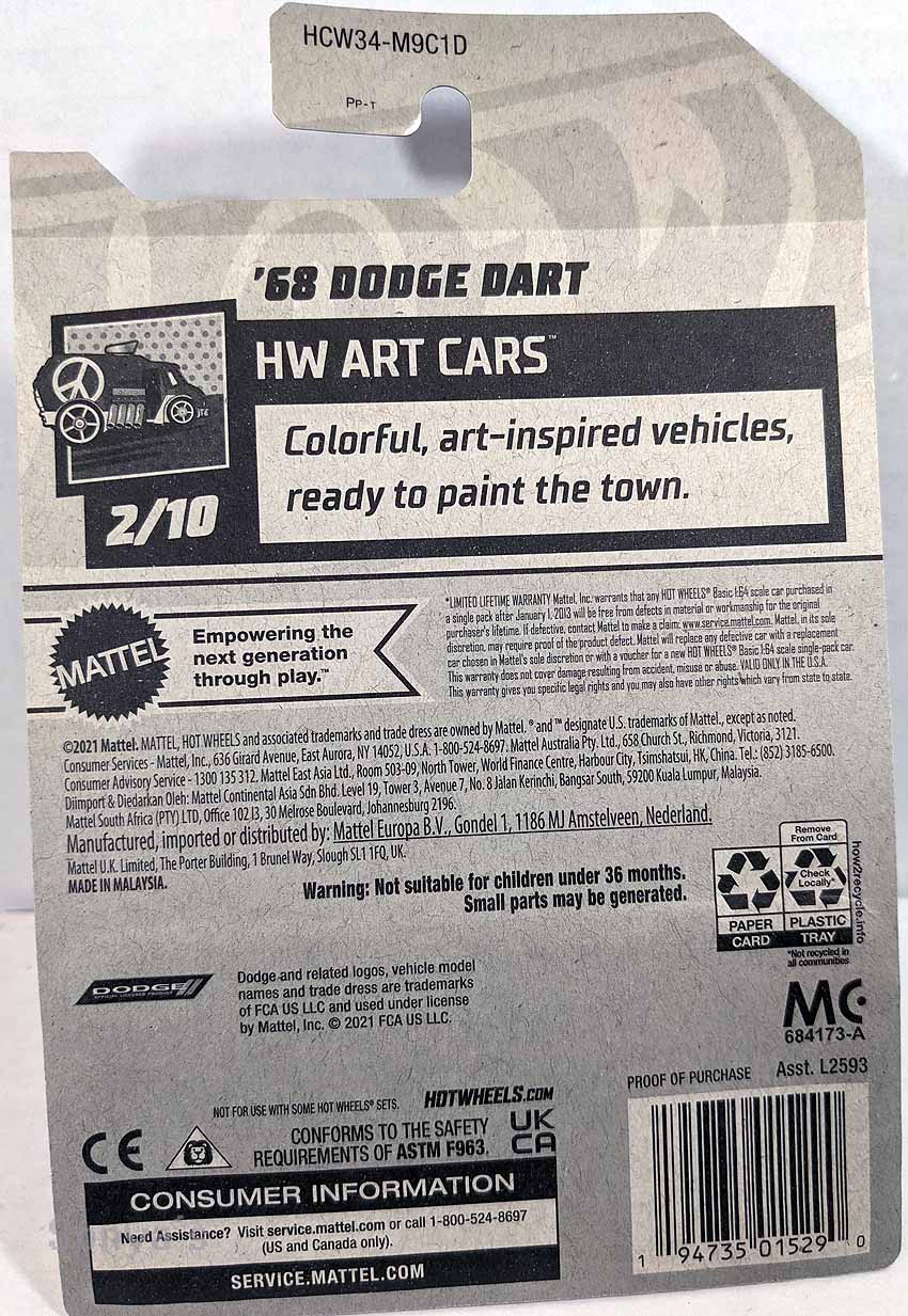 Striking Dodge Dart from the Art Cars group-number 2 of 10. An explosion of primary colors across a white background with bi colored wheels-red and blue with white rims. The letter U is on the roof.