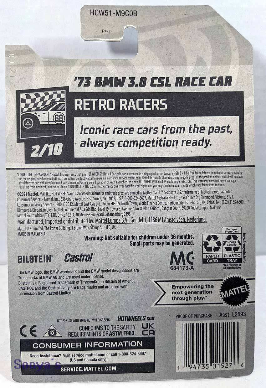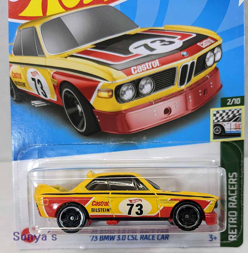 A welcome addition to the Retro Racers group, this 73 BMW is car 2 of 10. In a classic red and yellow color scheme, it has black accents and racing tampos. The number 73 is on the side and it is on a red base.