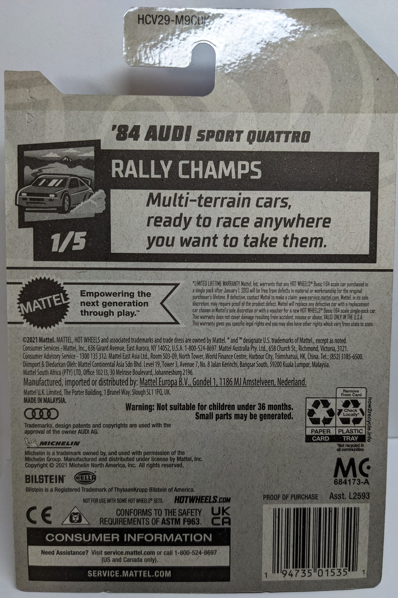 One of my favorite mainlines this year, my favorite color yellow looks great on this snappy car with lots of racing tampos and black, gray, red striping. The windows are dark tinted and the wheels are white multispokes. Painted front lights complete the look along with the black base. From Rally Champs, car 1 of 5.