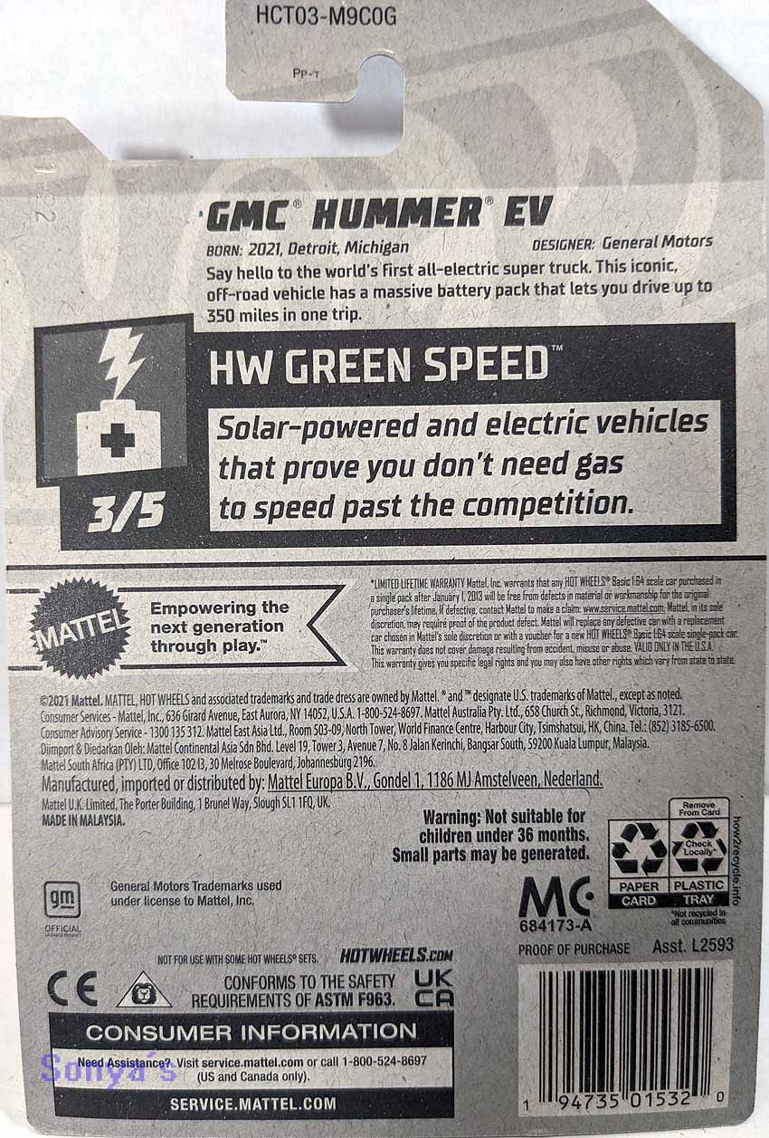 The top is out and the weather is fine. super sporty Hummer features bright yellow paint, large off road tires with silver hubs, painted lights and all black interior. From HW Green Speed, car 3 of 5.