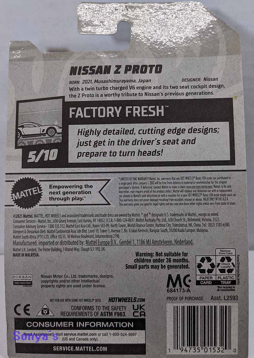 Long awaited Z Proto in a bright yellow and blacked out windows. Detailed painted lights front and rear along with molded side mirrors. Rides on a black base with gold double spoked tires. From Factory Fresh, #5 of 10.