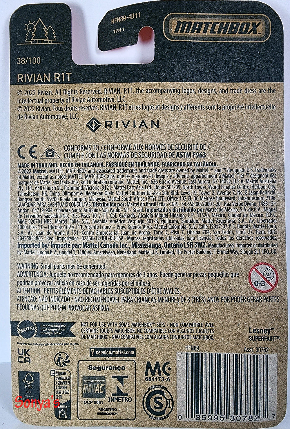 MBX Rivian features large utility tires, painted lights front and rear along with dark windows and black bedliner. Experience authentic detail and realistic performance with this unique addition to your toy car collection.