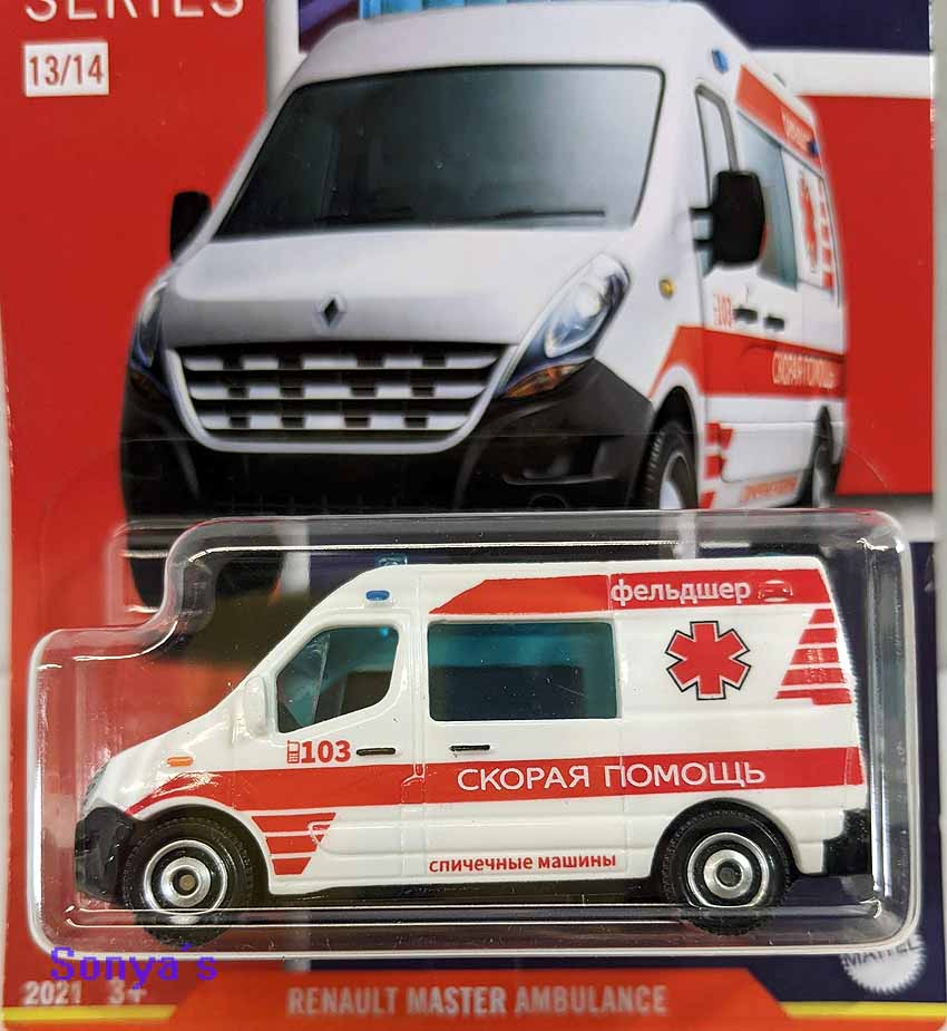 Russian Master Ambulance in white with red accents. Blue tinted windows, silver hubs and a black base completes the look. Number 13 of 14 in the Global Series.