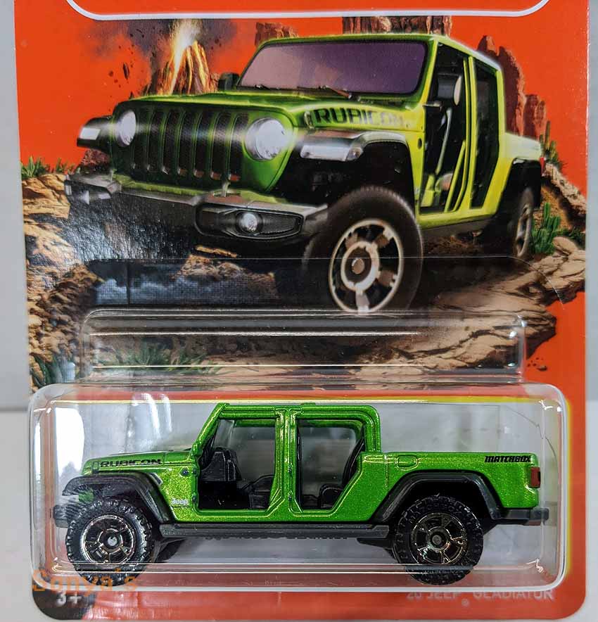 Sporty acid green Gladiator with the doors and windows out with black interior and black bedliner. Painted rear lights and off road tires complete the look.