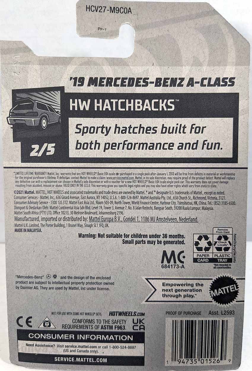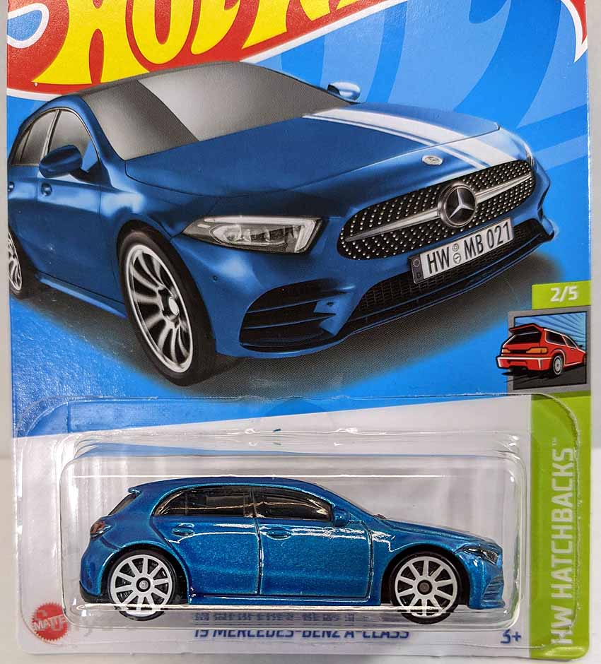 The Sporty Mercedes A Class nicely done in a bright blue with painted lights front and rear. smoked windows, side mirrors and multi spoked white rimmed tires sets it off. On a black plastic base. From HW Hatchbacks 2/5.