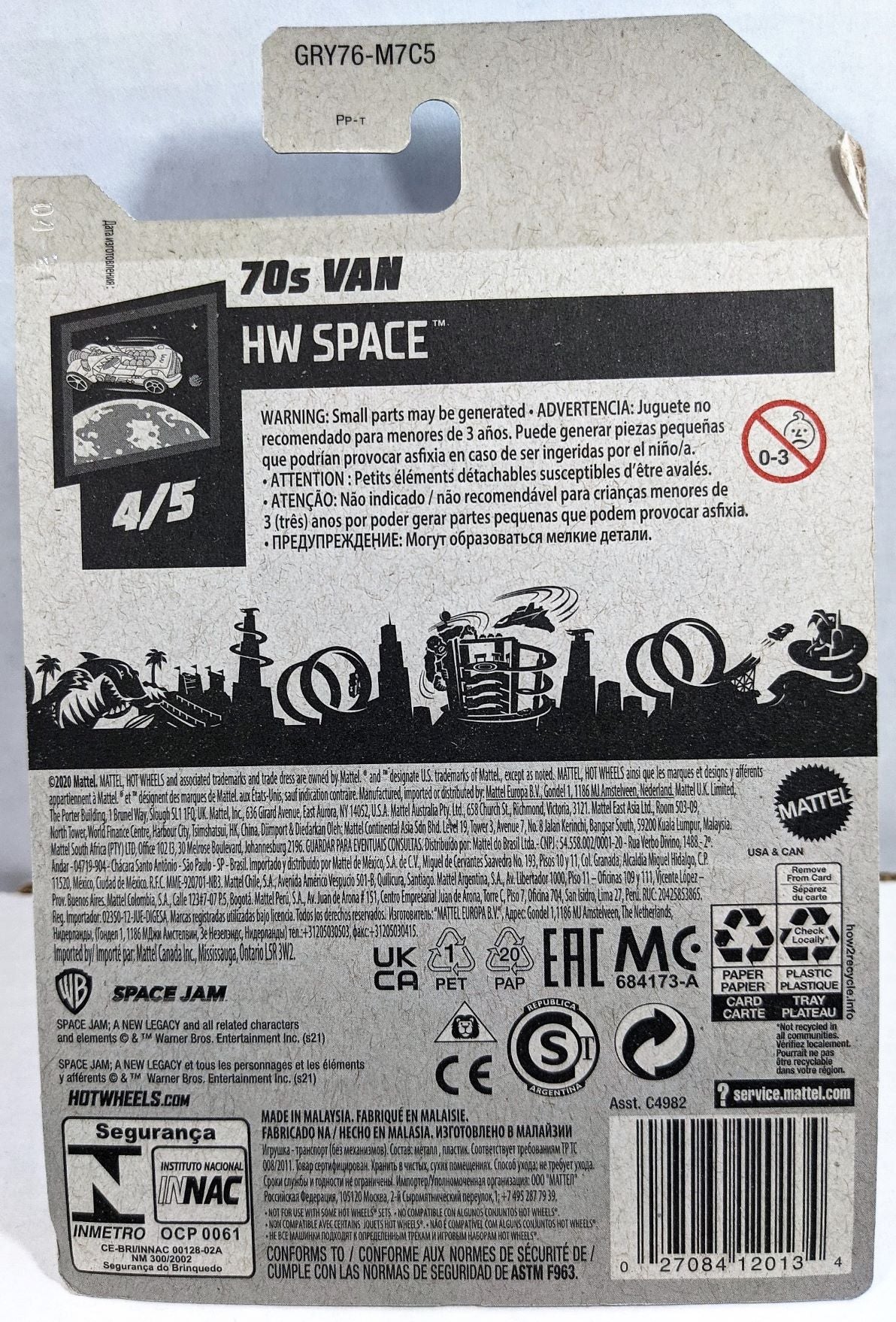 It's the Space Jam van! Long awaited Space Jam themed van with white background. Colorful blue and orange Space Jam artwork on the sides and Space Jam stamped on the front. On a black base with double 5 spoked copper wheels. Card is dinged on 2 edges. From HW Space, car 4 of 5