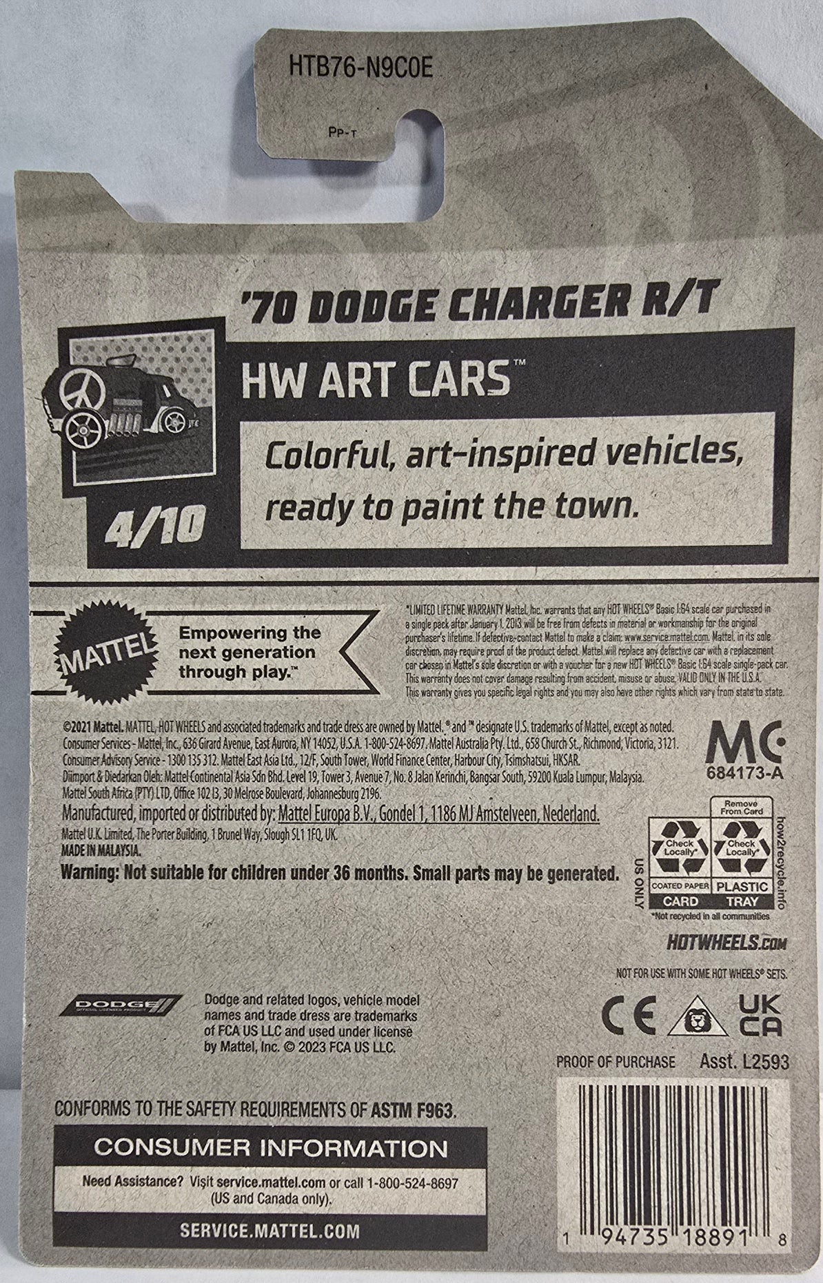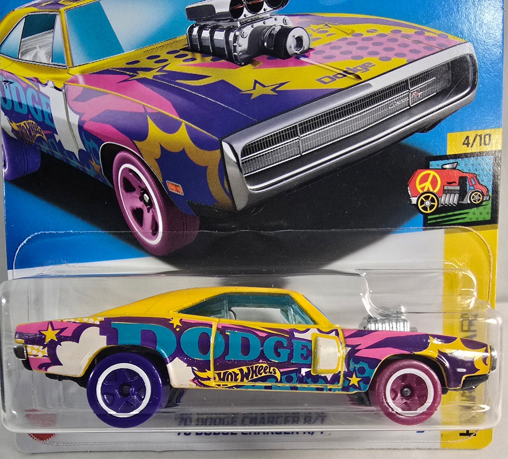 From the popular group of Art Cars, this recolor is mostly yellow with pink and purple coming in second. Dodge is on the side and features dual colored wheels in pink and purple. On a black base. Car 4 of 10 in the Art Car group.