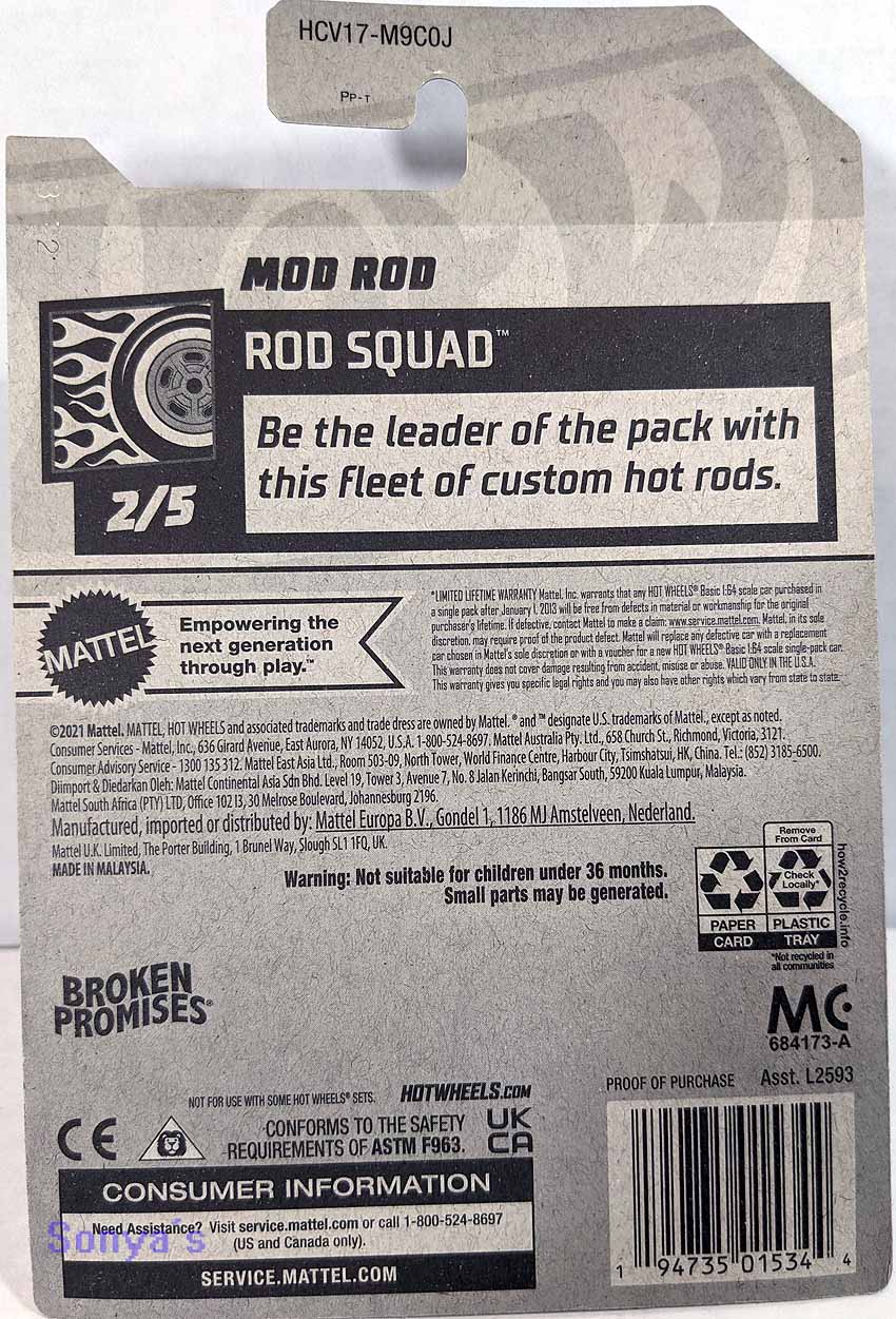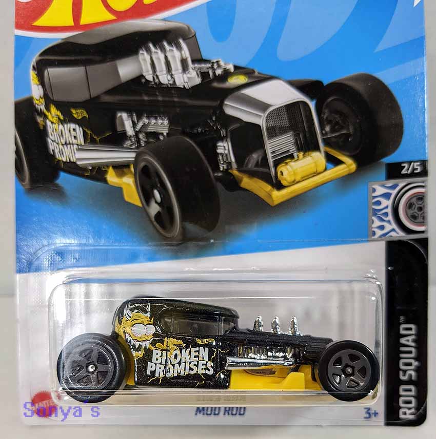 Yet another Mod Rod, the extended version with the long wheelbase. Has gray spoked tires, chrome accents and is painted a dark gray/black metallic. Broken Promises is written on the side and it rides on a bright yellow plastic base. From Rod Squad, #2 of 5