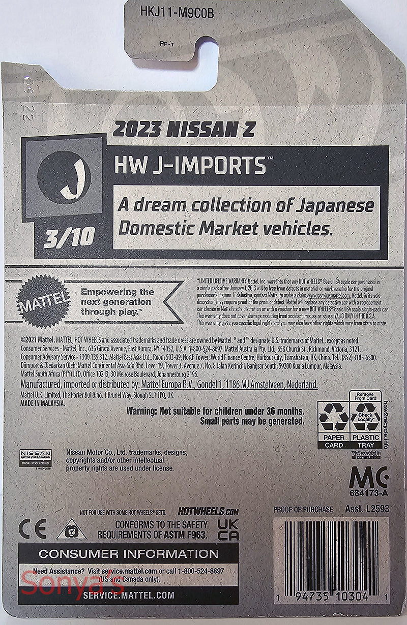 This special edition Hot Wheels Blue 2023 Nissan Z 2023 has detailed features like a Nissan car and is painted in a bright blue color for a fun and stylish look. Perfect for collecting or racing, this will be a great addition to any Hot Wheels collection. Features blacked out tires and painted lights. From HW J-Imports, car 3 of 10.