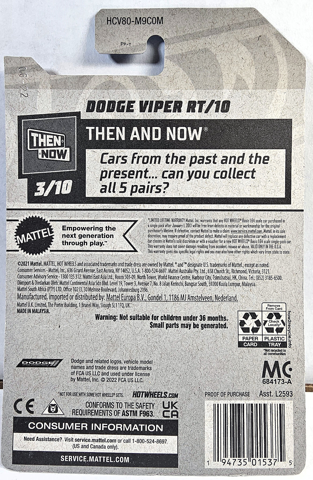 From the Then and Now set is a Viper done in the classic Hot Wheels livery, riding on a white base. Smoked windshield and red rimmed tires complete the look. Car 3 of 10